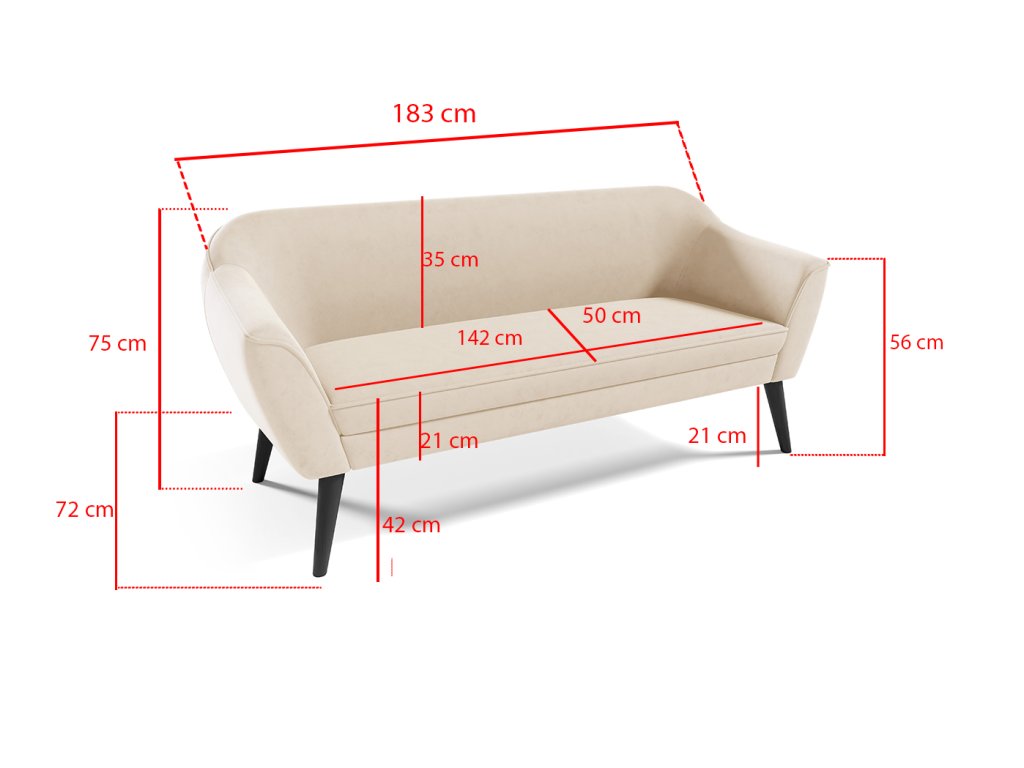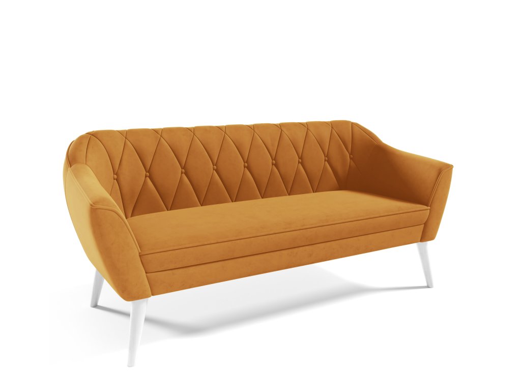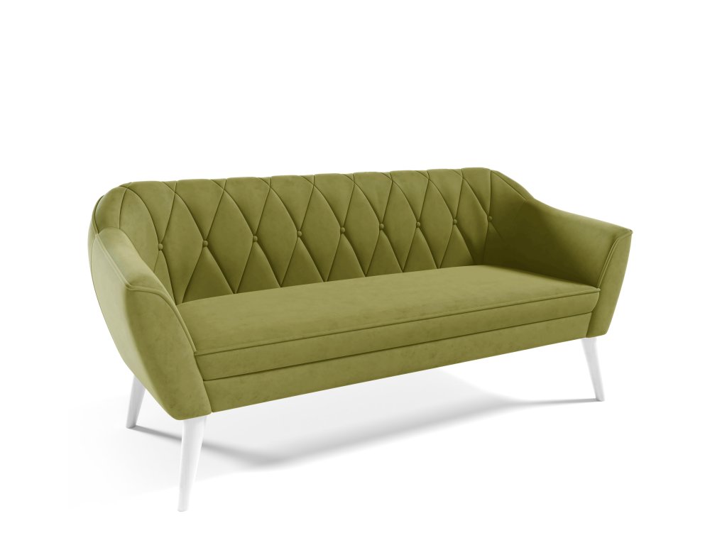 Šířka 183 cm, výška 75 cm, hloubka 72 cm. Elegantní a moderní čalouněná pohovka Alexia s dřevěnými nožičkami a prošívaným opěradlem zdobeným knoflíky. Možnost výběru z potahových látek i nožiček z několika barevných variant.