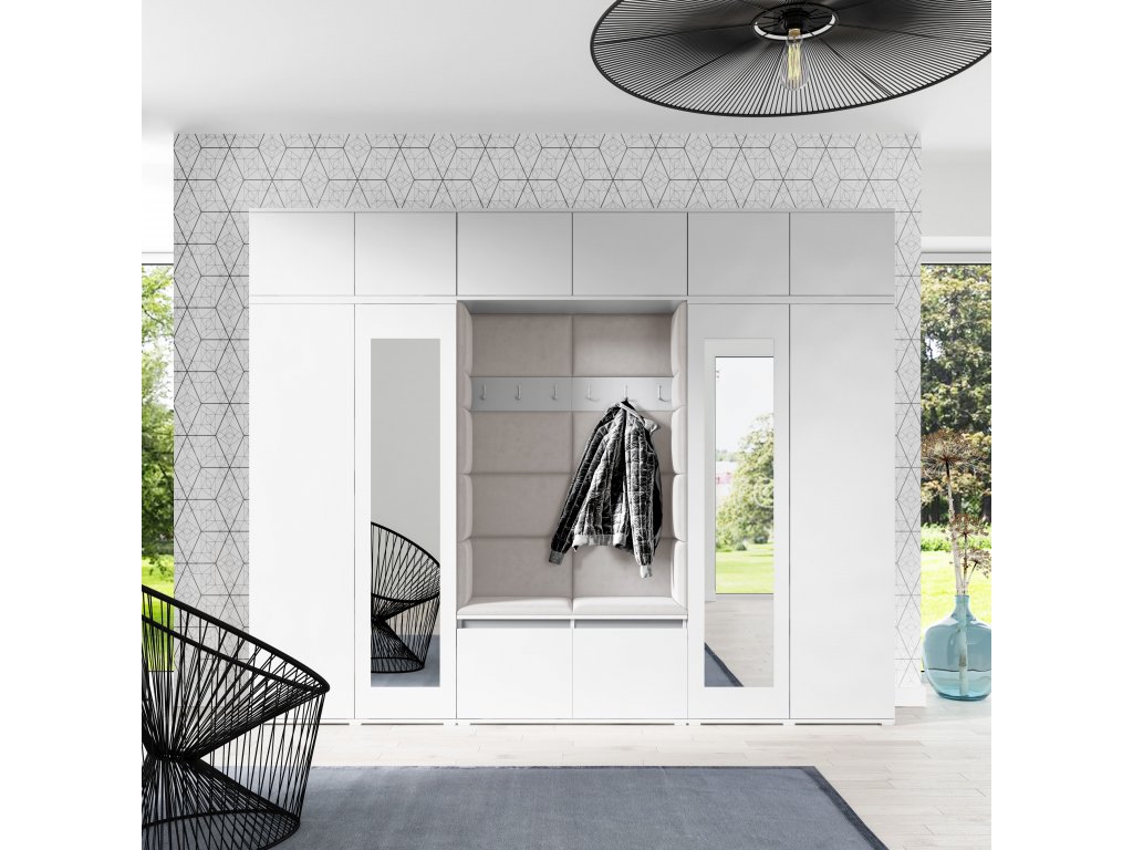 Šířka 280 cm, hloubka 40 cm, výška 225 cm. Prostorná předsíňová sestava v bílém dekoru s nevšedními čalouněnými panely, dvěma zrcadlovými skříněmi s nástavcem, botníkem s výklopnými dvířky, věšákem s šesti háčky a závěsnou skříňkou.