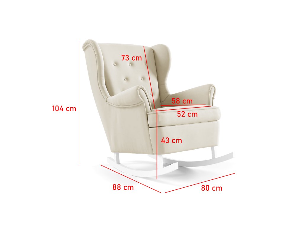 Šířka 80 cm, výška 104 cm, hloubka 88 cm. Houpací křeslo Trixie s nožičkami z masivu, pohodlným sedákem a opěradlem vyplněným pěnou. Možnost výběru z potahových látek i nožiček z několika barevných variant.