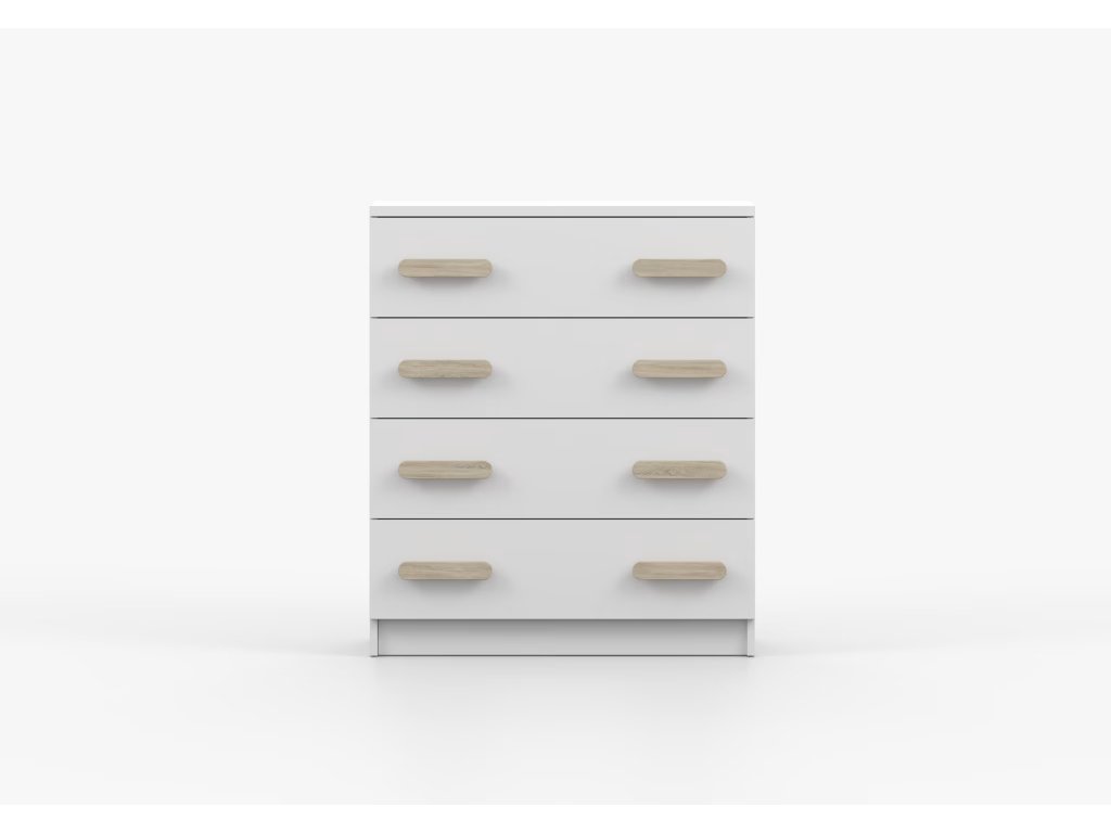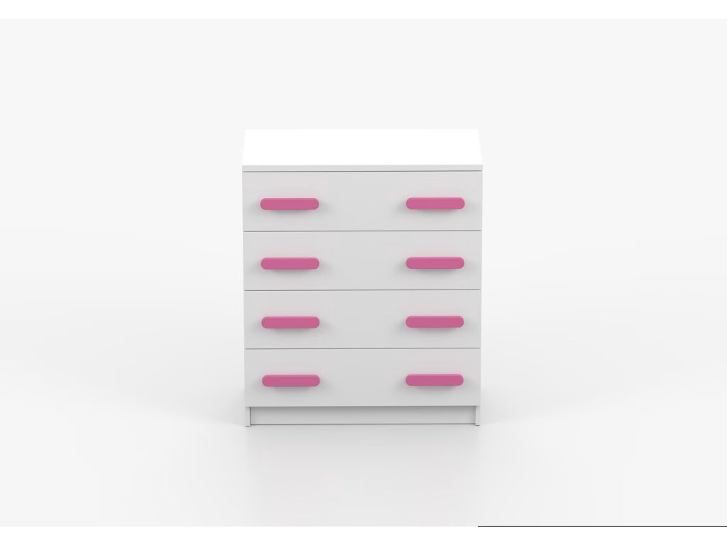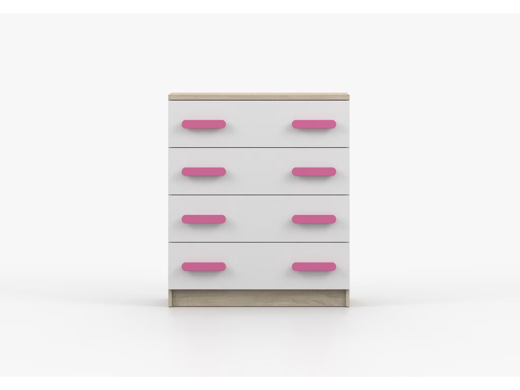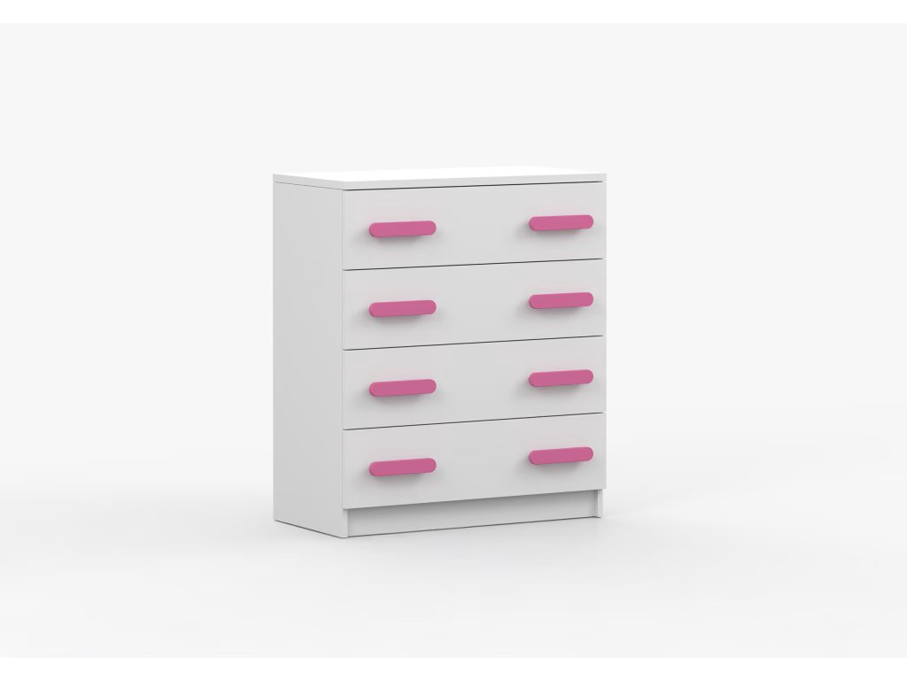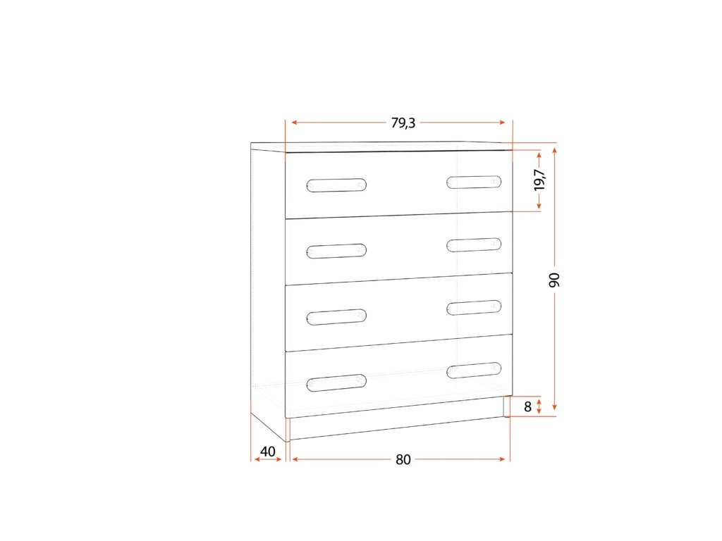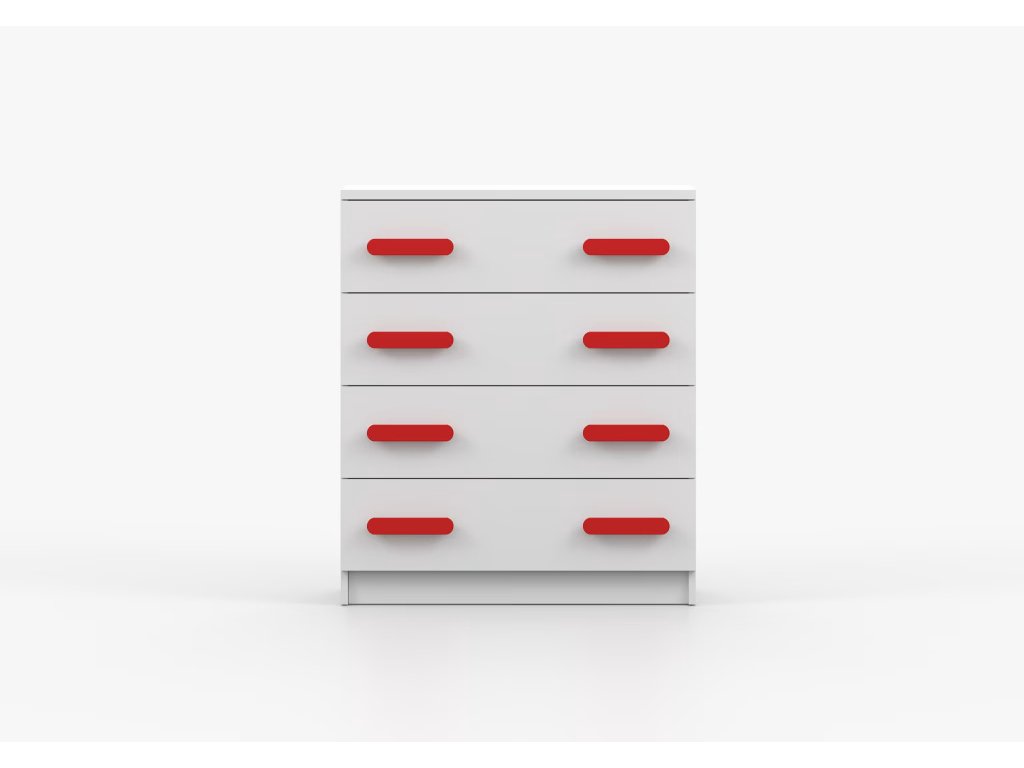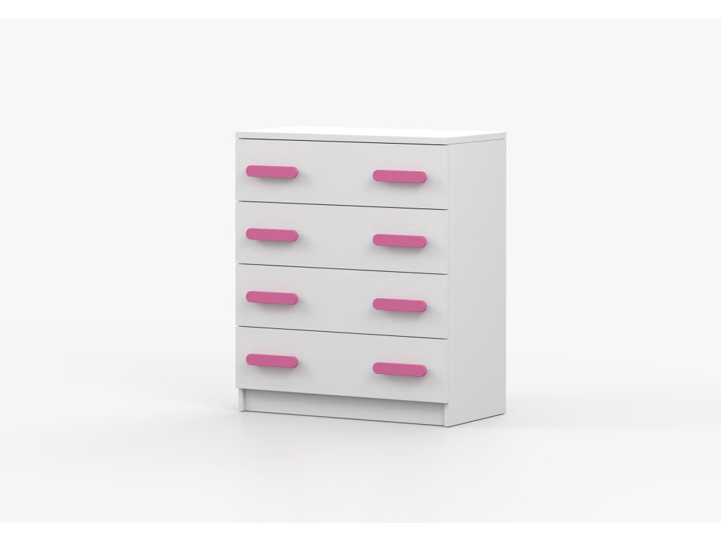 Šířka 80 cm, hloubka 40 cm, výška 90 cm. Komoda s 4 šuplíky, které mají velký úložný prostor. Komoda disponuje dřevěnými úchytkami, které lze vybrat z 8 barev.