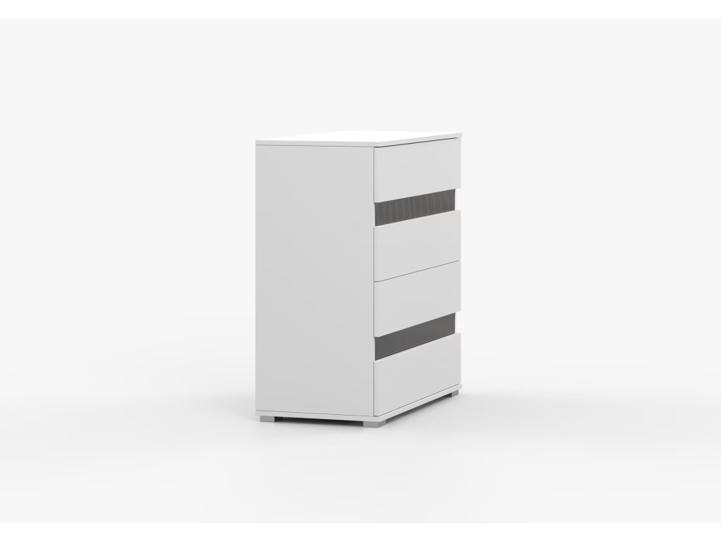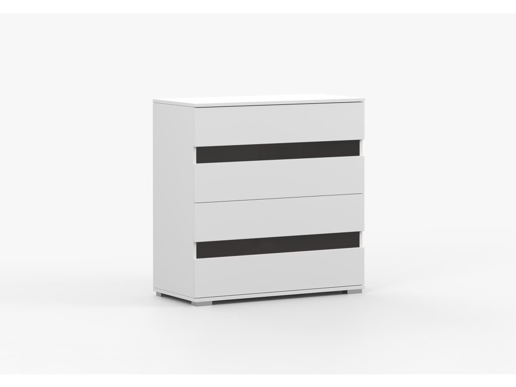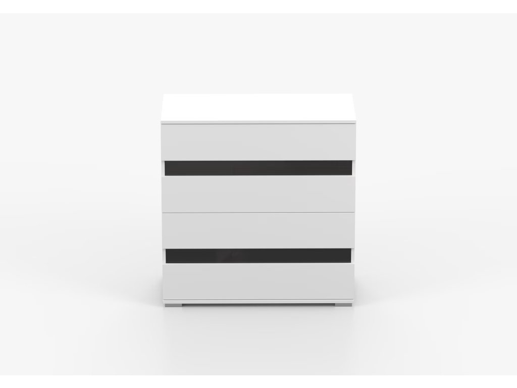 Komoda Liran s módními lakovanými deskovými vložkami je výrazný kus nábytku s moderním a stylovým vzhledem, který odpovídá současným trendům. Disponuje čtyřmi prostornými zásuvkami. Kombinace polomatné černé a matné bílé dodává komodě sofistikovaný vzhled.