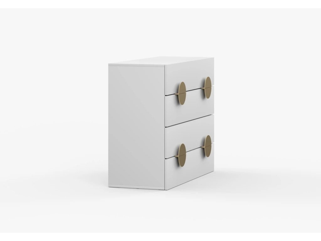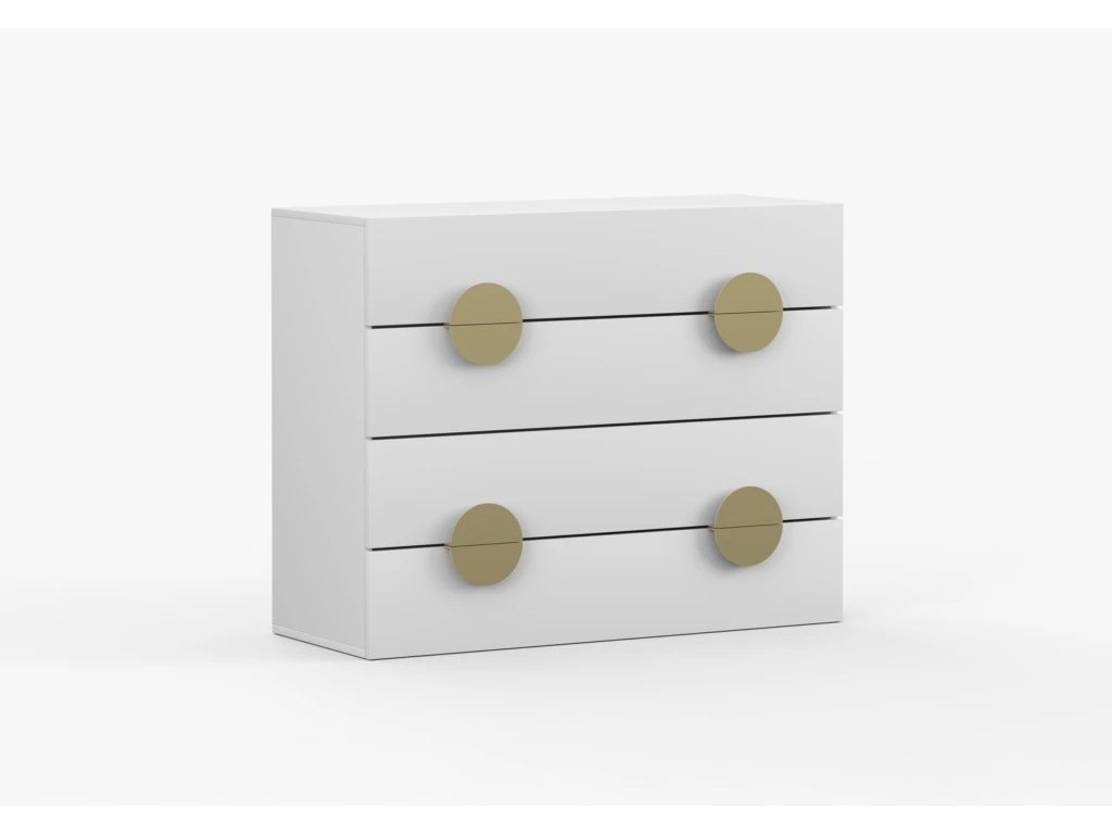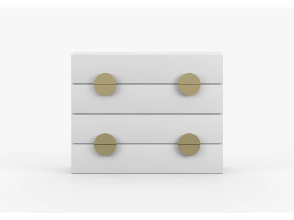 Šířka 90 cm, hloubka 42 cm, výška 90 cm. Praktická komoda se 4 šuplíky, které mají velký úložný prostor. Komoda disponuje zlatými úchytkami.