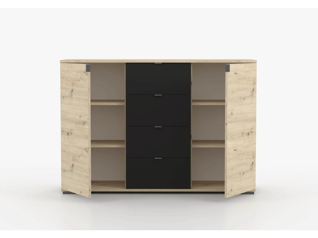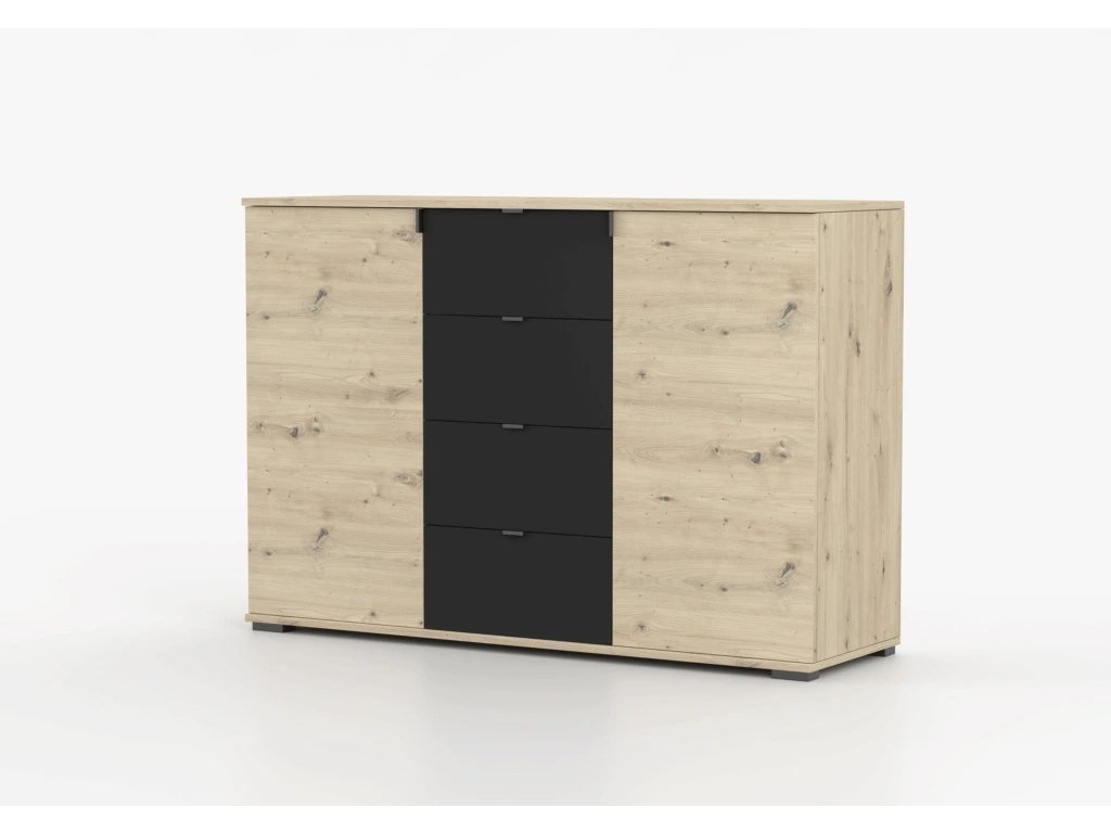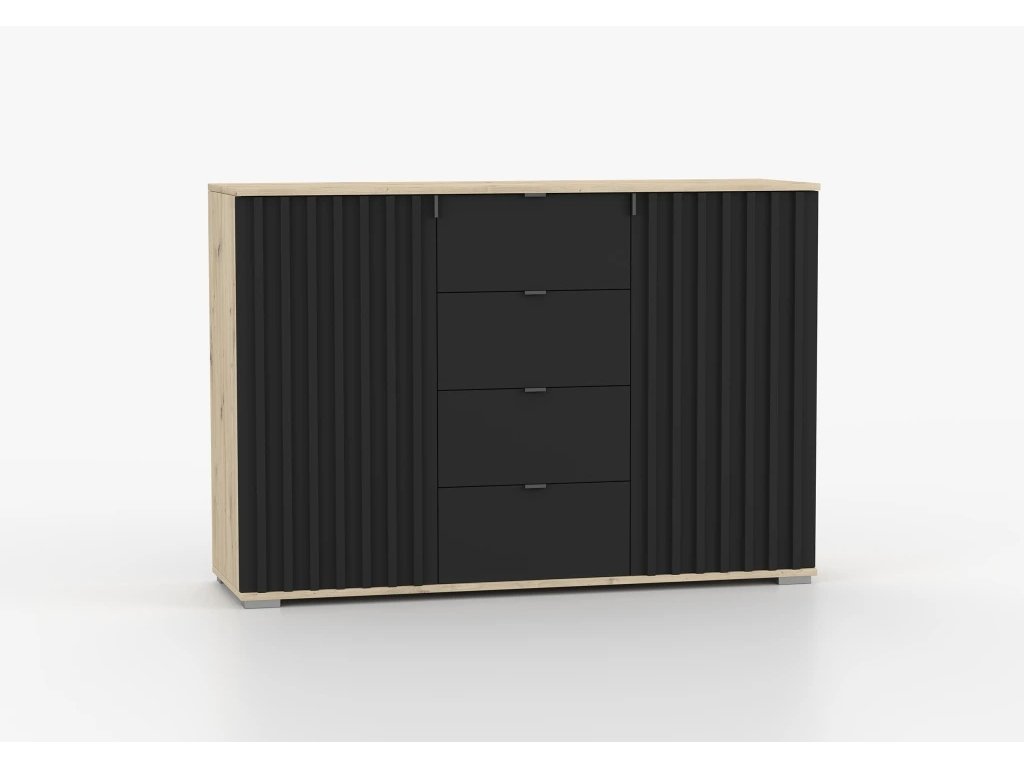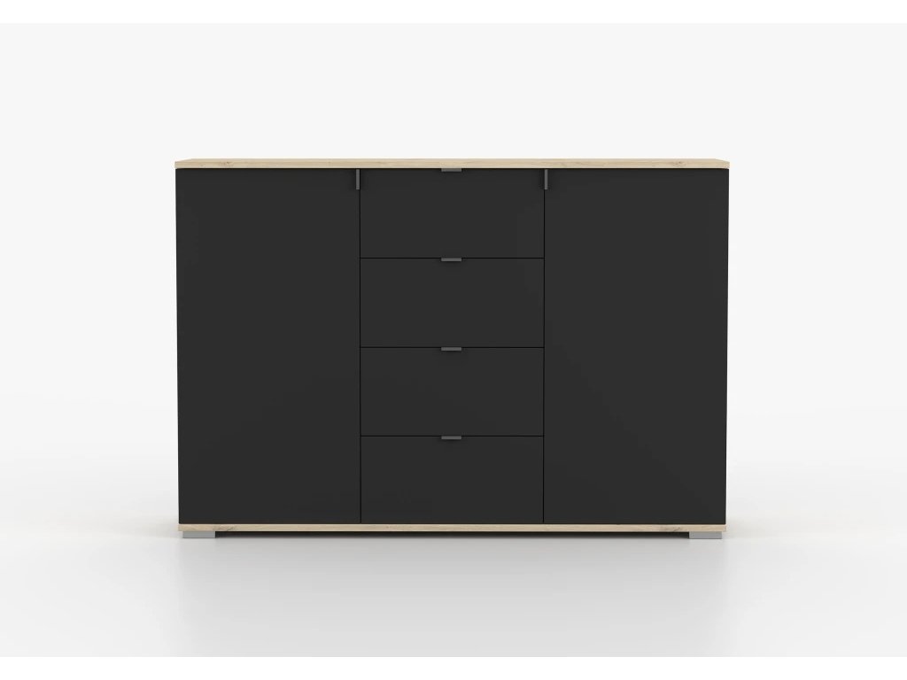 Šířka 135 cm, hloubka 44 cm, výška 93 cm. Praktická komoda se 4 šuplíky a dvěma dvířky, které mají velký úložný prostor. Komoda disponuje malými PVC nožičkami.