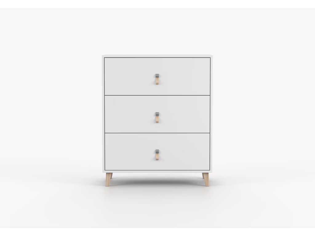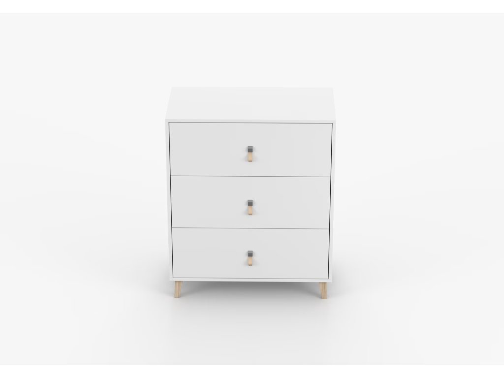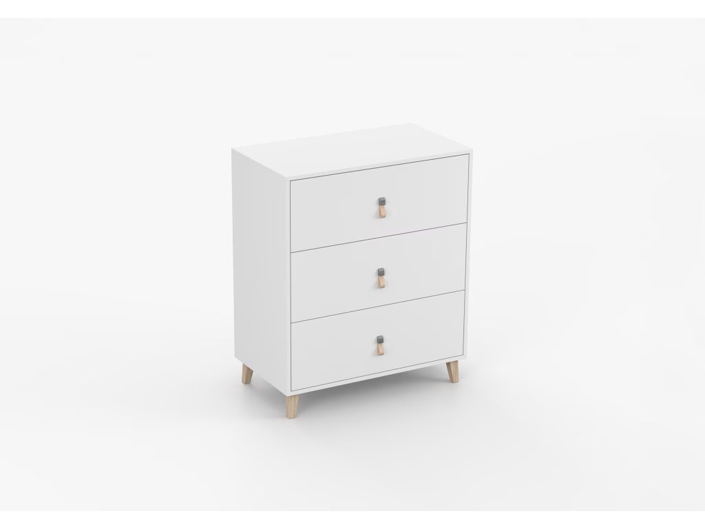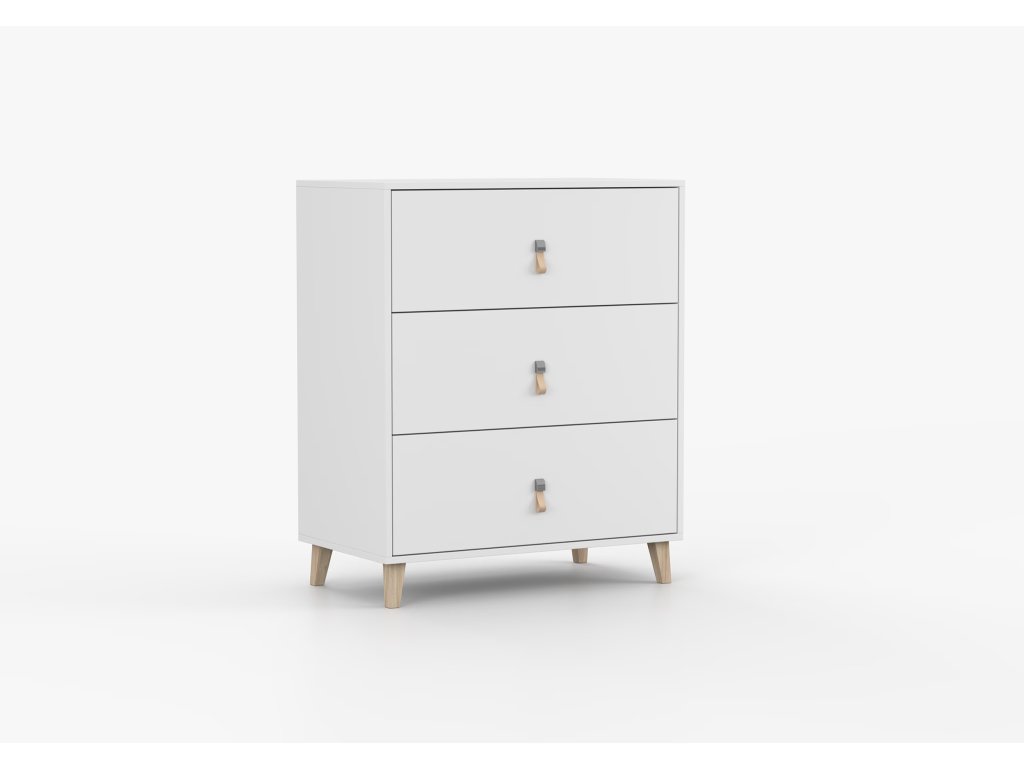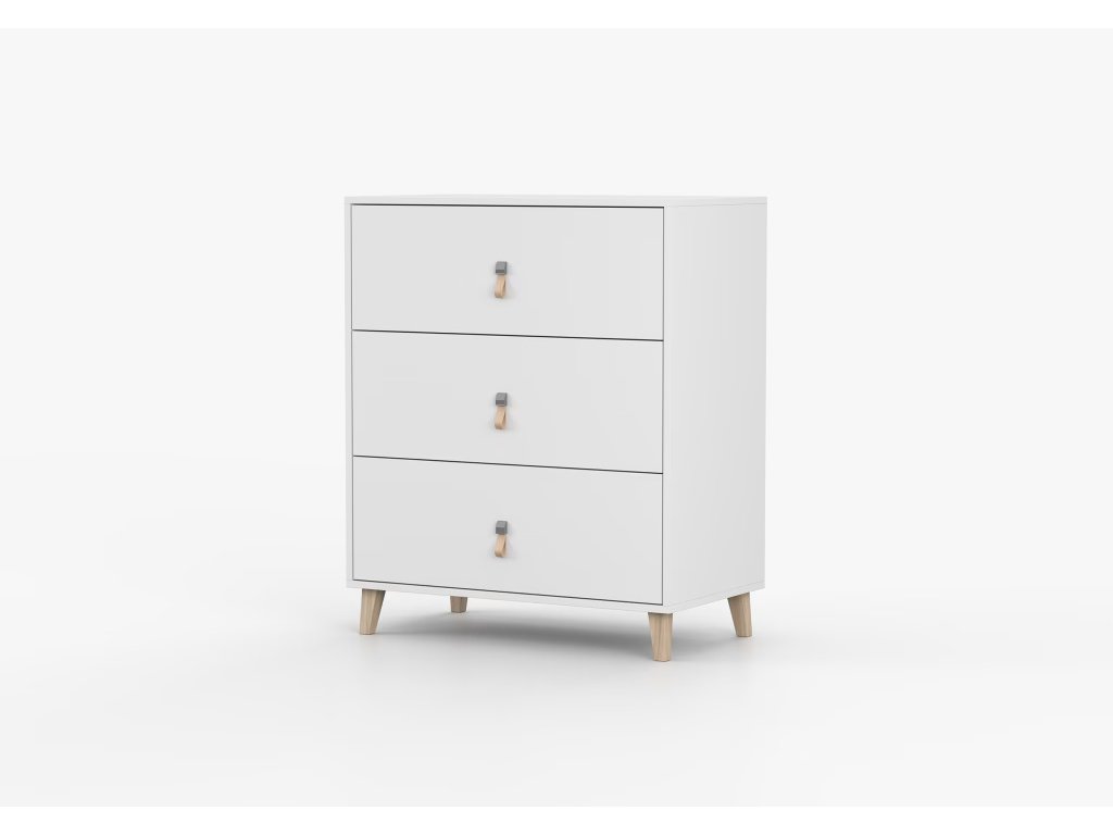 Komoda Fadi kombinuje moderní skandinávský styl s funkčností a pohodlím každodenního používání. Je vybavena třemi prostornými zásuvkami, díky kterým si můžete uspořádat a uklidit prostor v dětském pokoji.