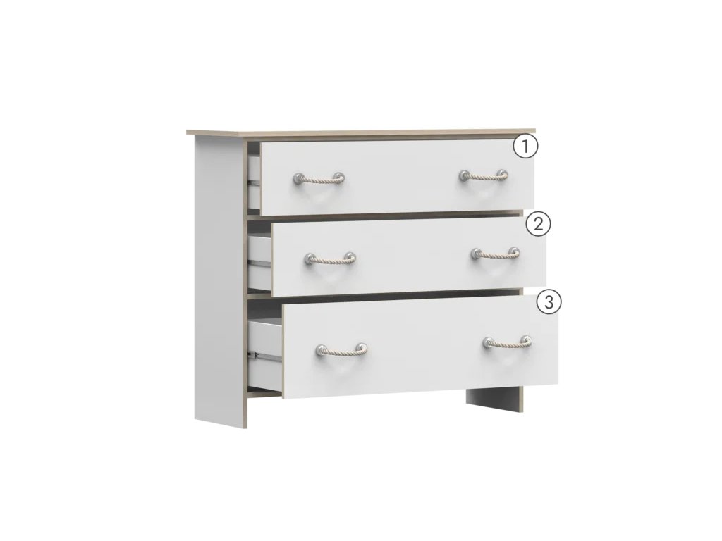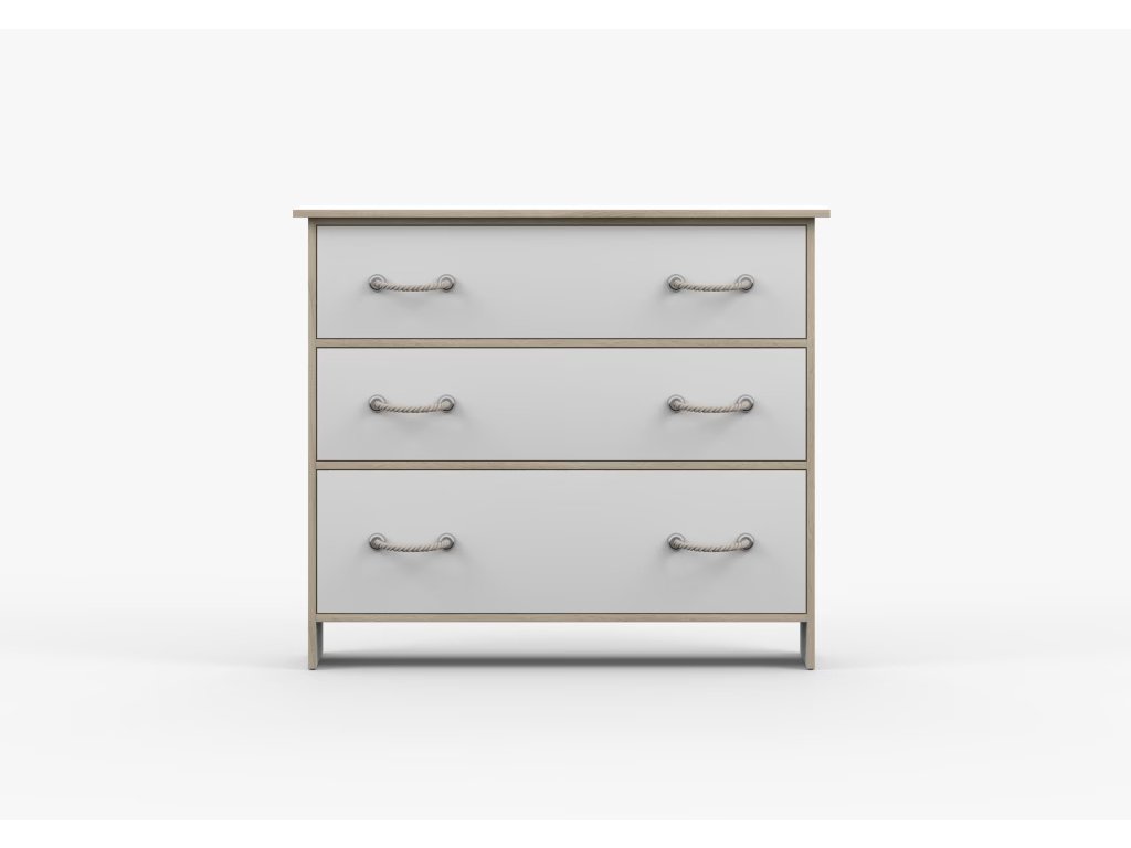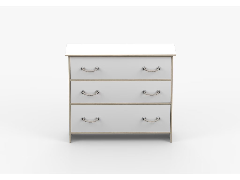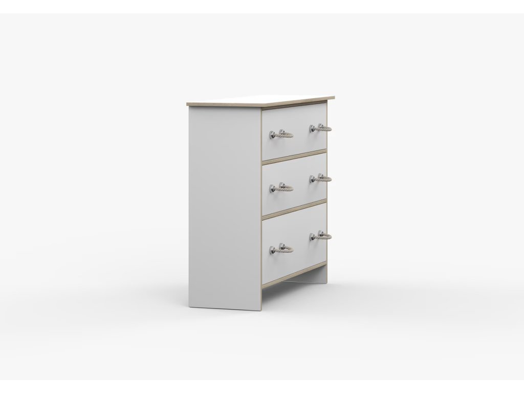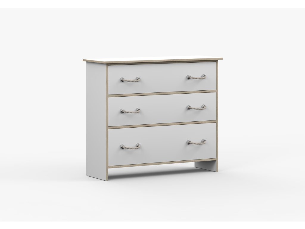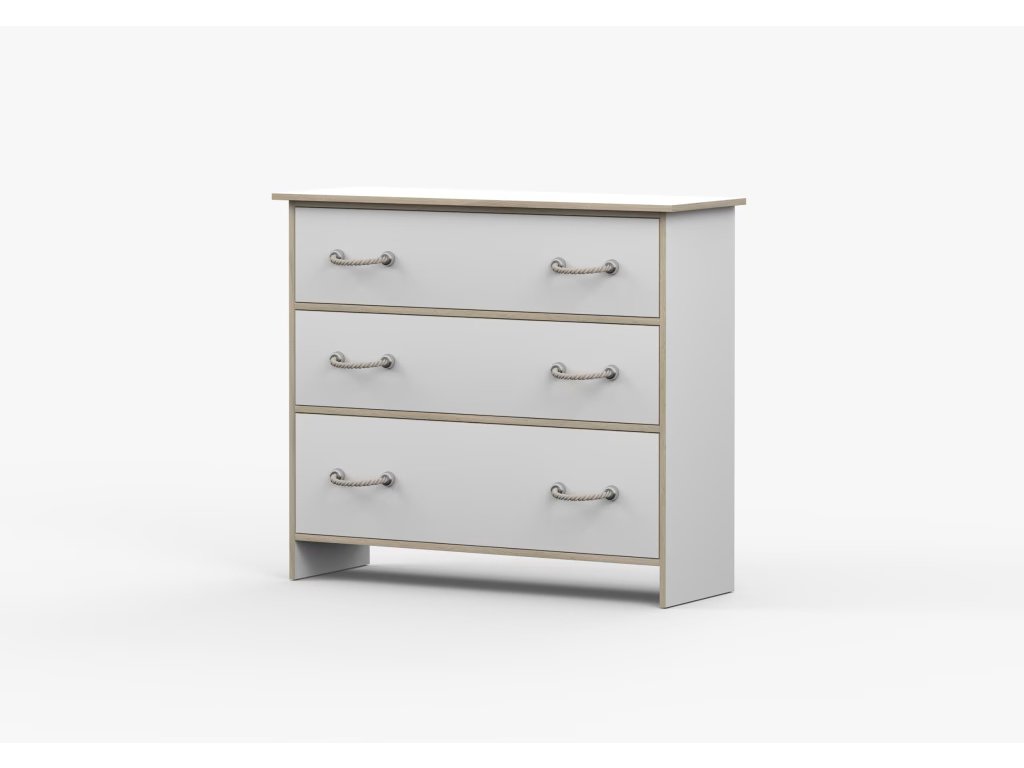 Komoda Karpo kombinuje moderní námořnický styl s funkčností a pohodlím každodenního používání. Je vybavena třemi prostornými zásuvkami, díky kterým si můžete uspořádat a uklidit prostor v dětském pokoji. Minimalistické šňůrkové úchytky mohou dodat eleganci a moderní design každému interiéru.