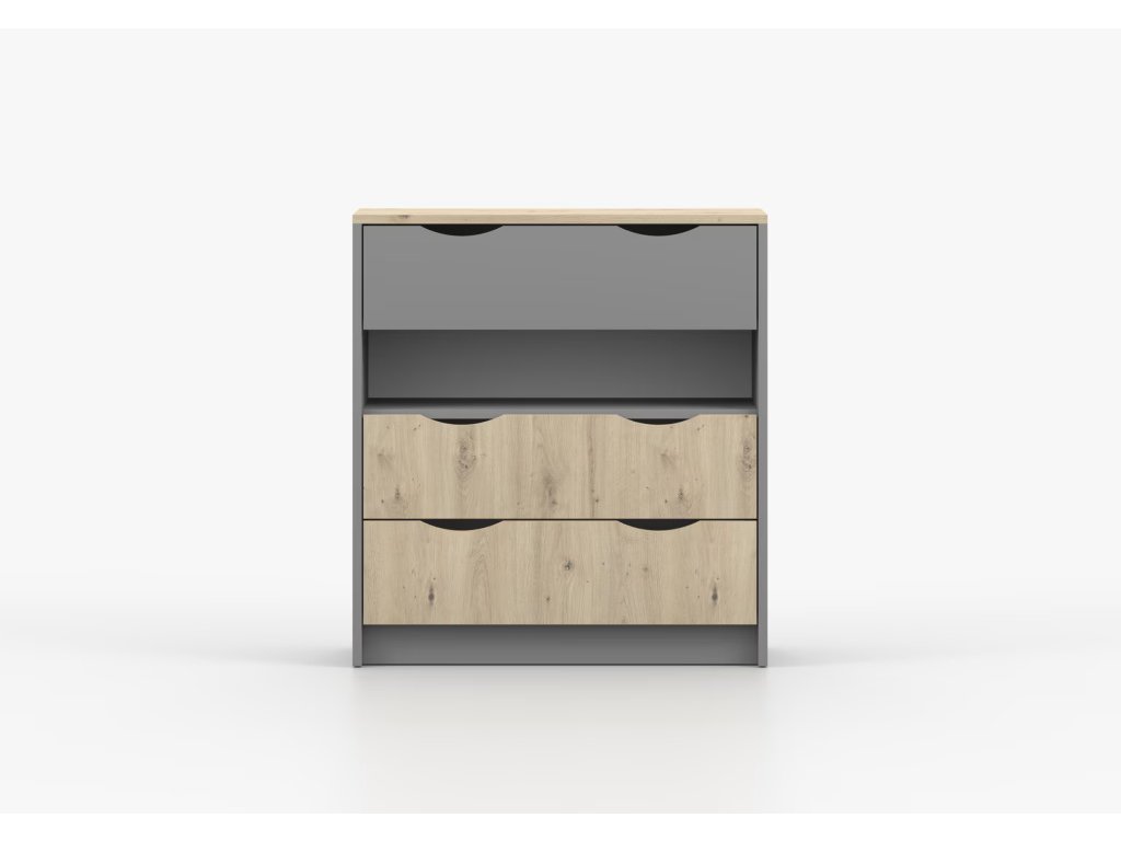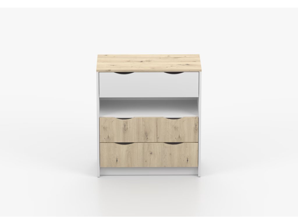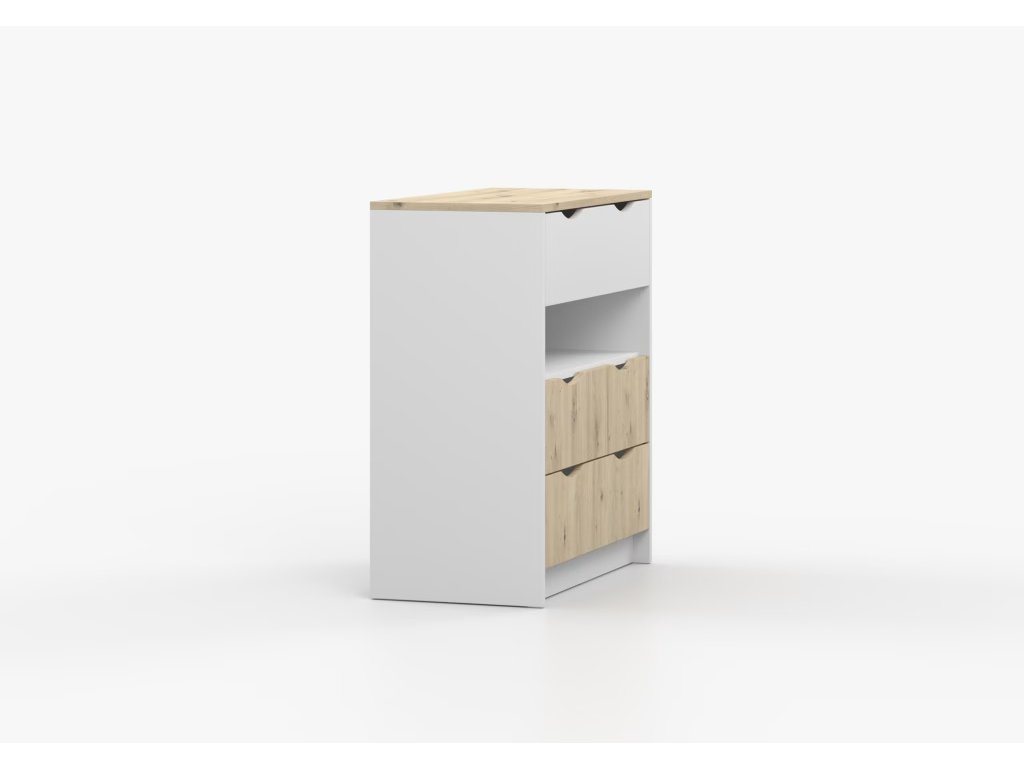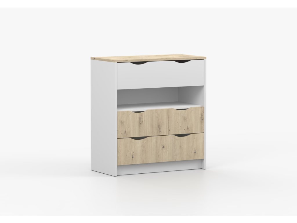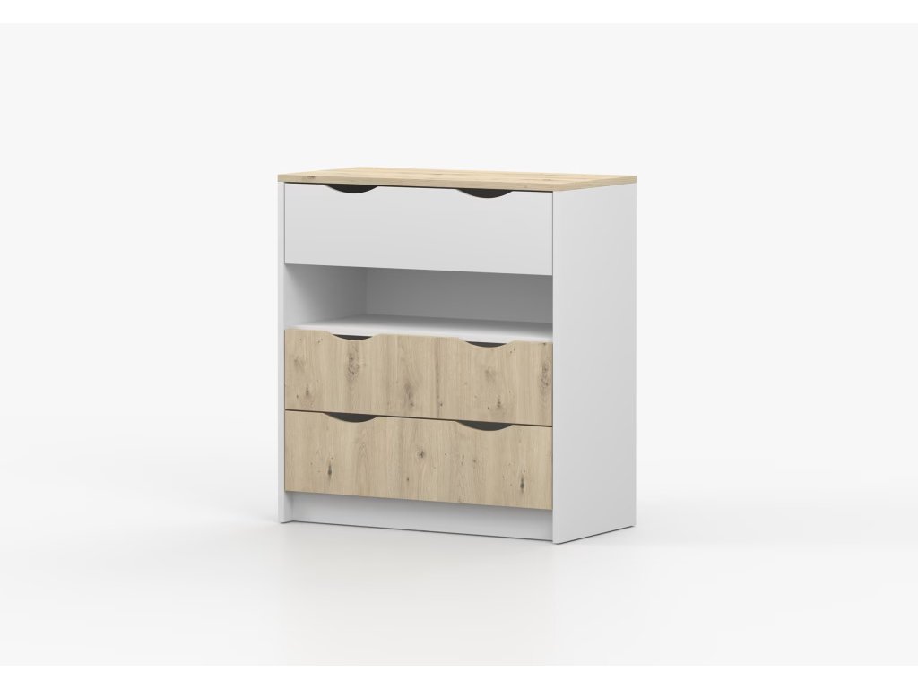 Komoda Jens je vyrobena z odolných materiálů a zaručuje stabilitu a trvanlivost. Její podstavec je pevný a zajistí stabilní nosnost. I přes postrádání úchytek se dá komoda velice snadno otevírat a zavírat.
