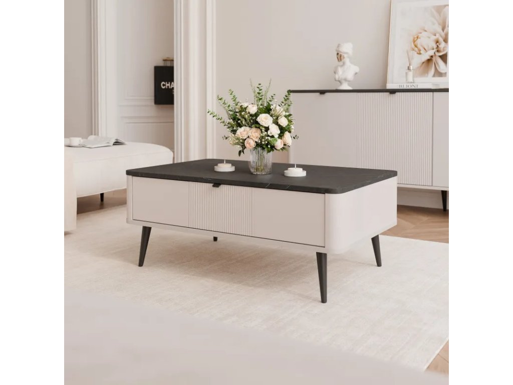 Jedinečný charakter nábytku umocňují kašmírově zbarvené, drážkované čela, které poskytují decentní, ale zároveň výrazný vzhled. Jejich trojrozměrná struktura jemně láme světlo na povrchu, vytváří hru stínů a zdůrazňuje eleganci celé kolekce. Stolek je postaven na štíhlých, černých kovových nohách, které mu nejen dodávají lehký a moderní charakter, ale také poskytují praktické řešení pro každodenní použití. Zvýšená konstrukce usnadňuje úklid – pod ní se snadno vejde čisticí robot, což výrazně usnadňuje udržování pořádku v domácnosti.