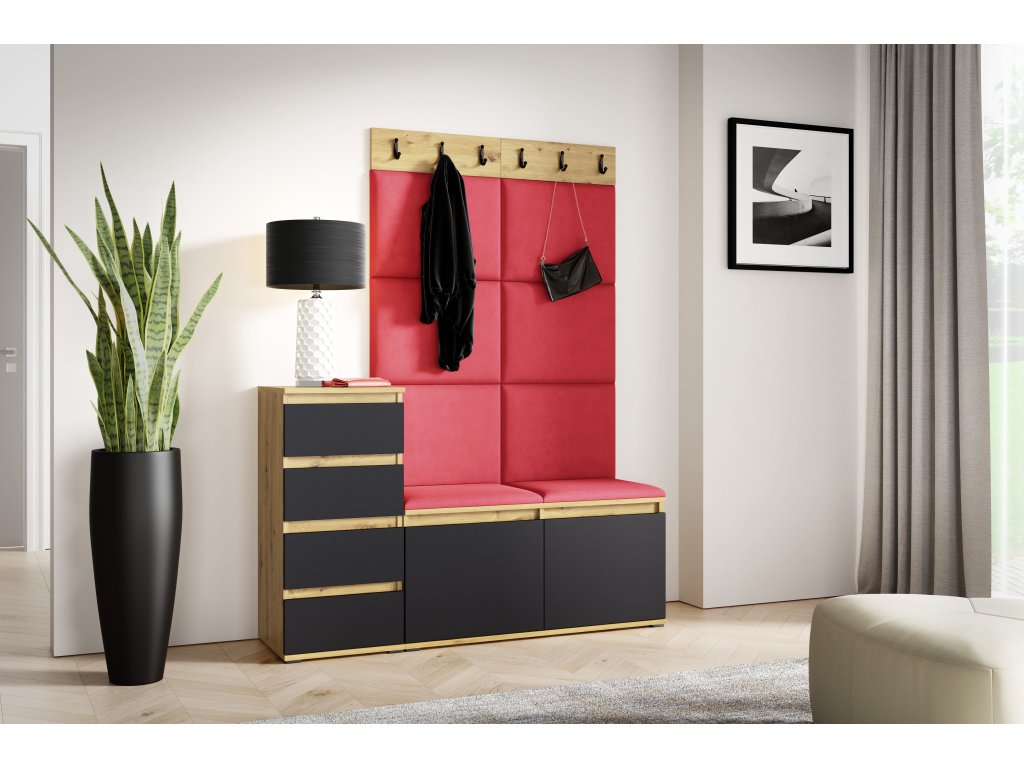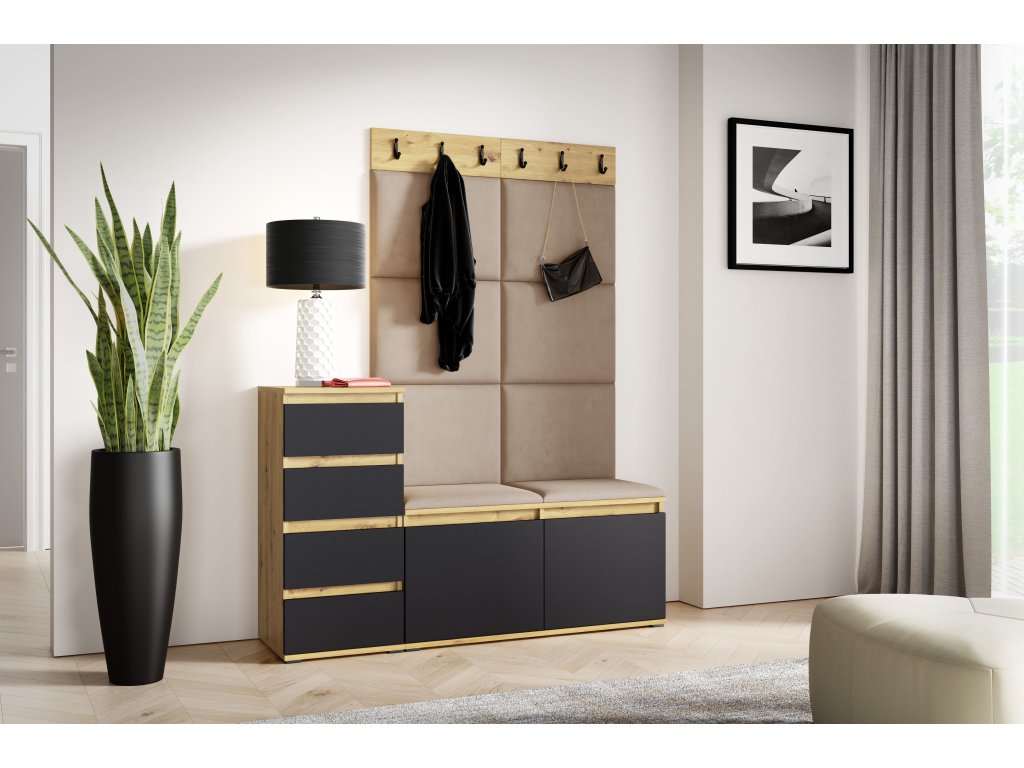 Šířka 130 cm, hloubka 40 cm, výška 185 cm. Malá předsíňová stěna v dekoru artisan/černá s nevšedními čalouněnými panely je sestavena z botníku s výklopnými dvířky, věšáku s šesti háčky a praktickou šuplíkovou komodou.