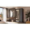 Šatní skříň s posuvnými dveřmi, která je zdobena stylovými lamelami a vybavena jedním velkým zrcadlem. Svým rozměrem se hodí například do menších moderně zařízených bytů.