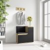Šířka 80 cm, hloubka 40 cm, výška 88 cm. Minimalistická sestava do chodby v dekoru artisan/černá s čalouněnými panely, malou skříňkou, výklopným botníkem a nástěnným věšákem.