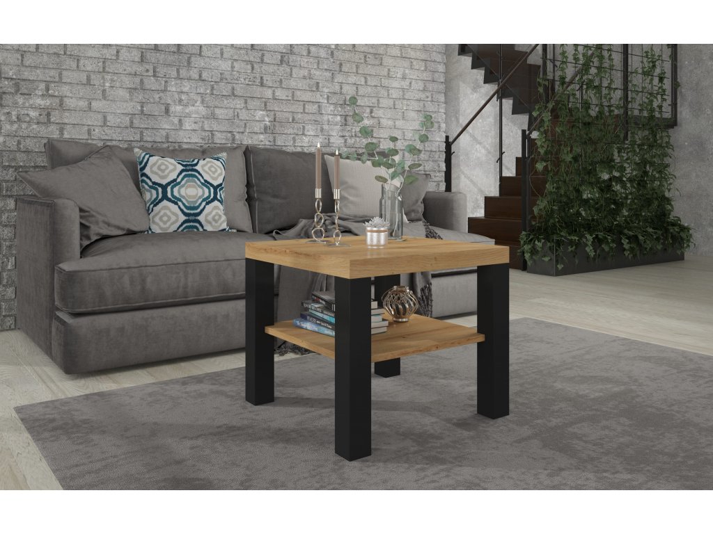 Délka 60 cm, šířka 60 cm, výška 51 cm. Minimalistický konferenční stolek do obývacího pokoje v moderním provedení s úložným prostorem v podobě police.