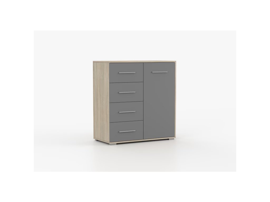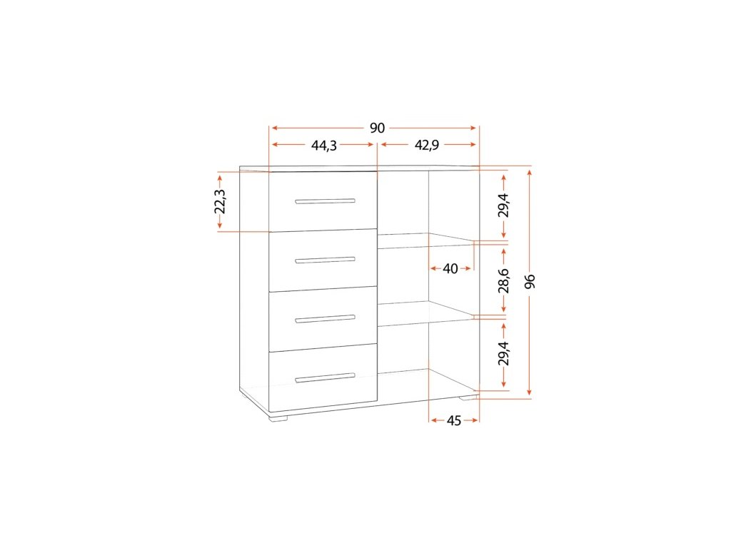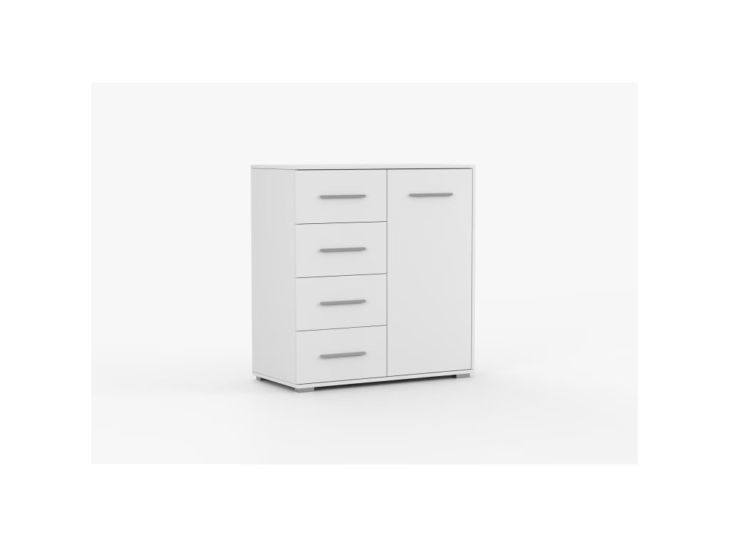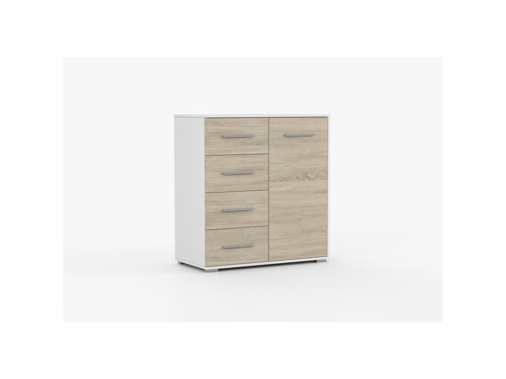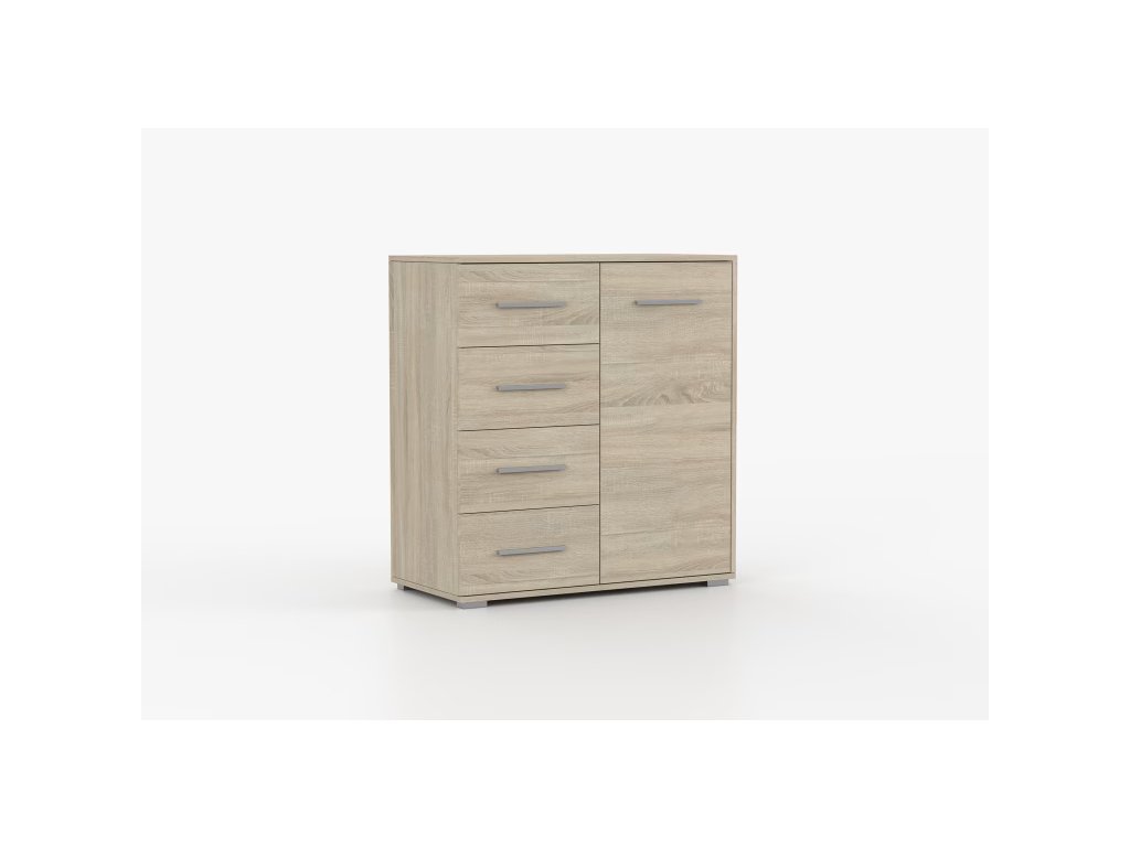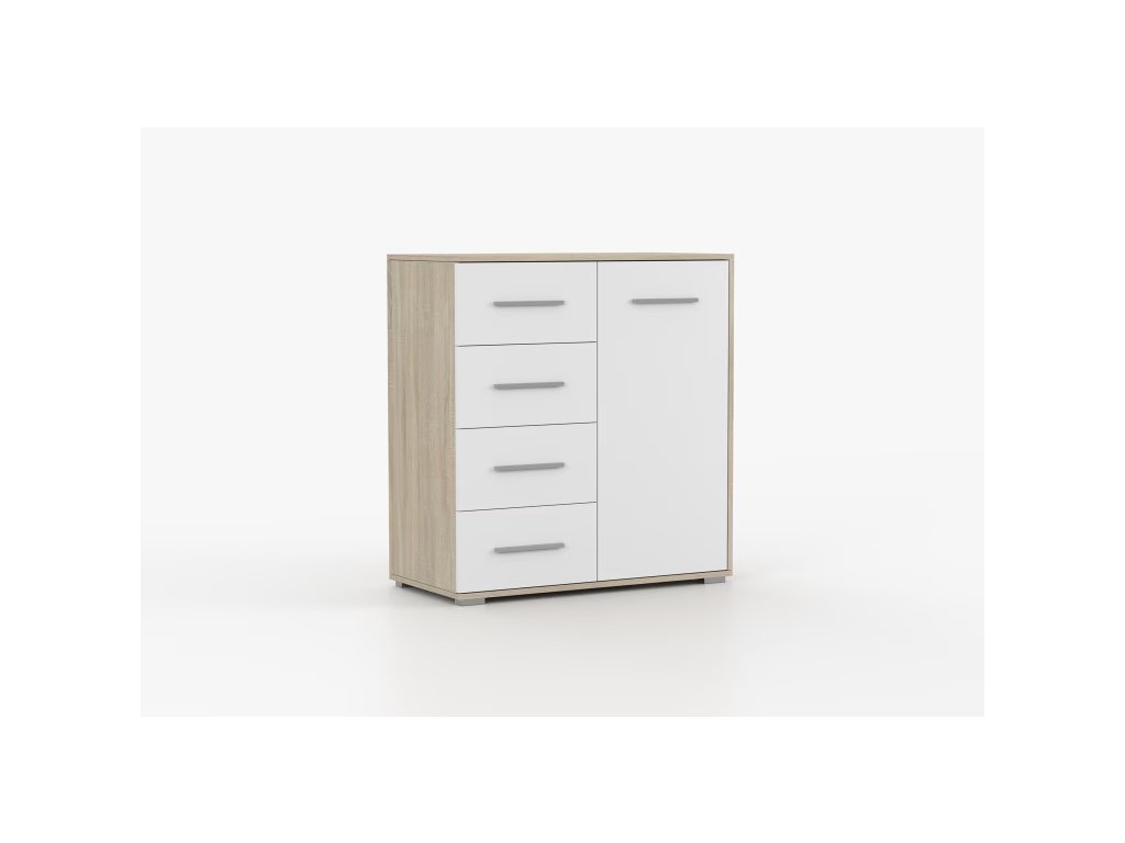 Šířka 90 cm, hloubka 45 cm, výška 96 cm. Praktická komoda s dvířky a 4 šuplíky, které mají velký úložný prostor. Komoda disponuje PVC úchytkami.