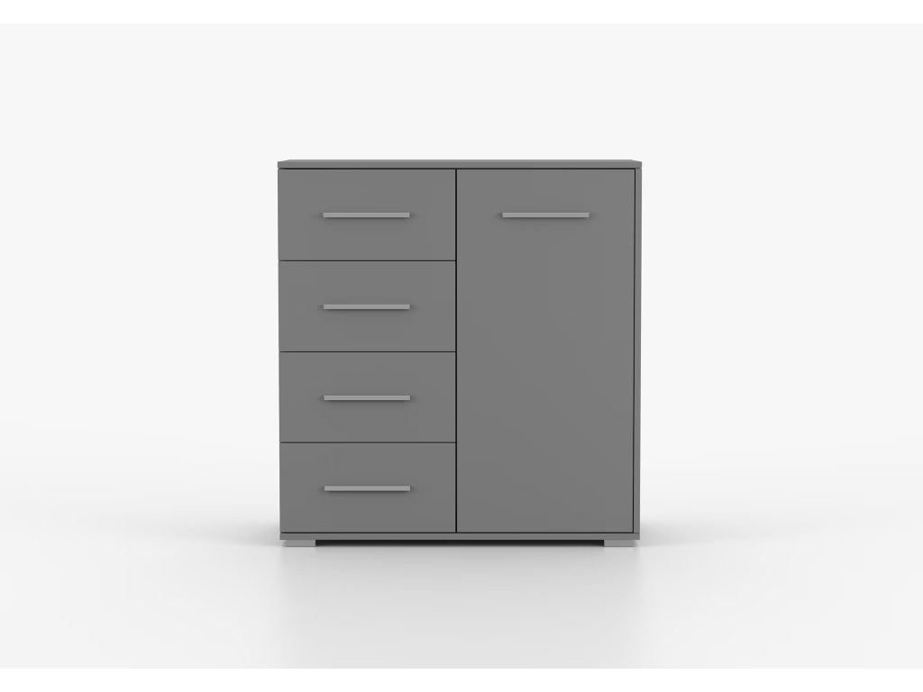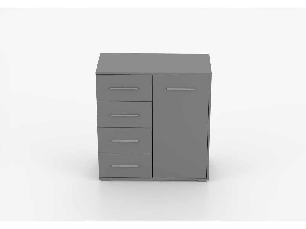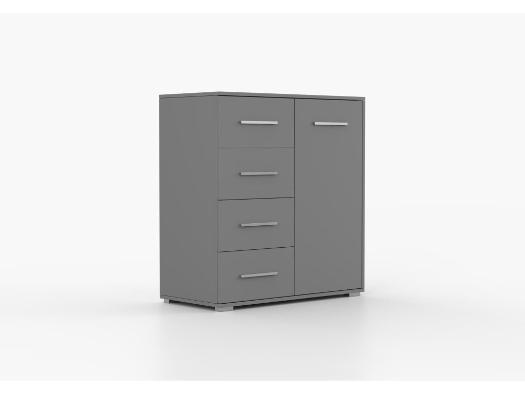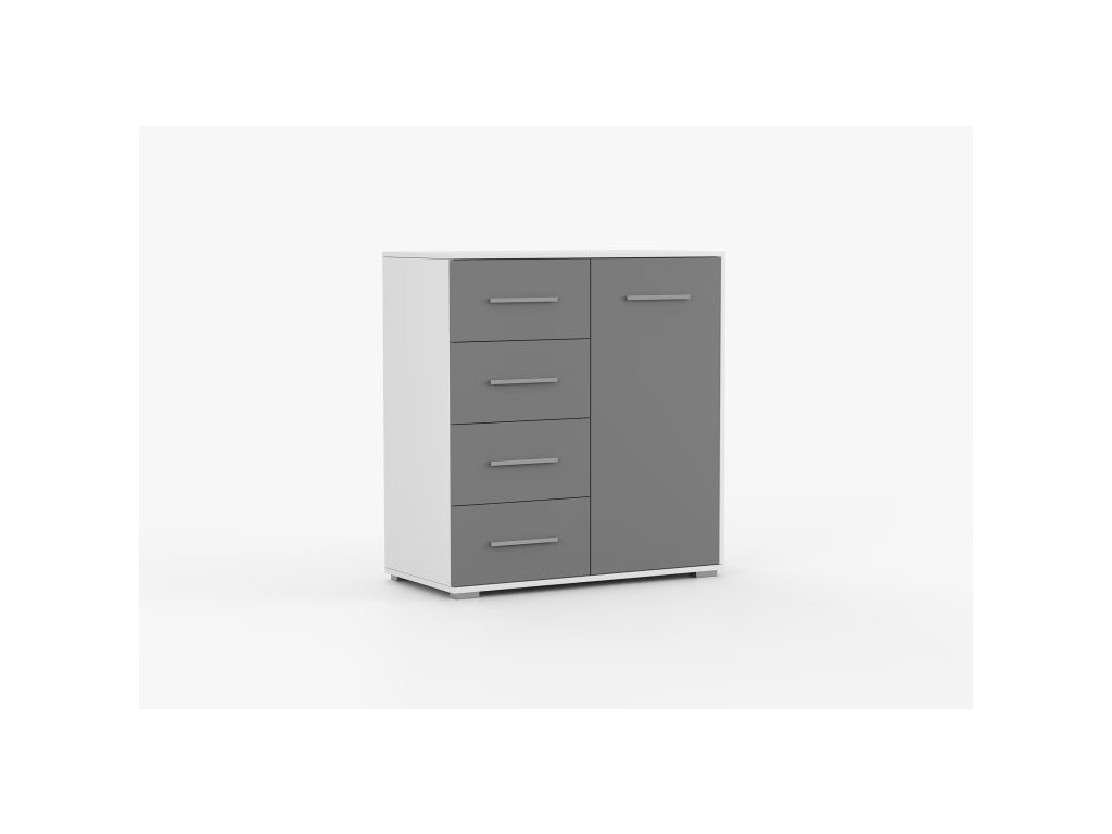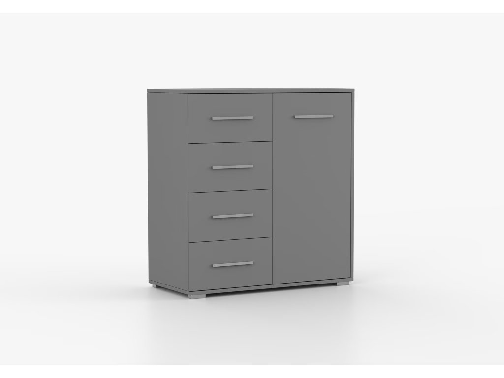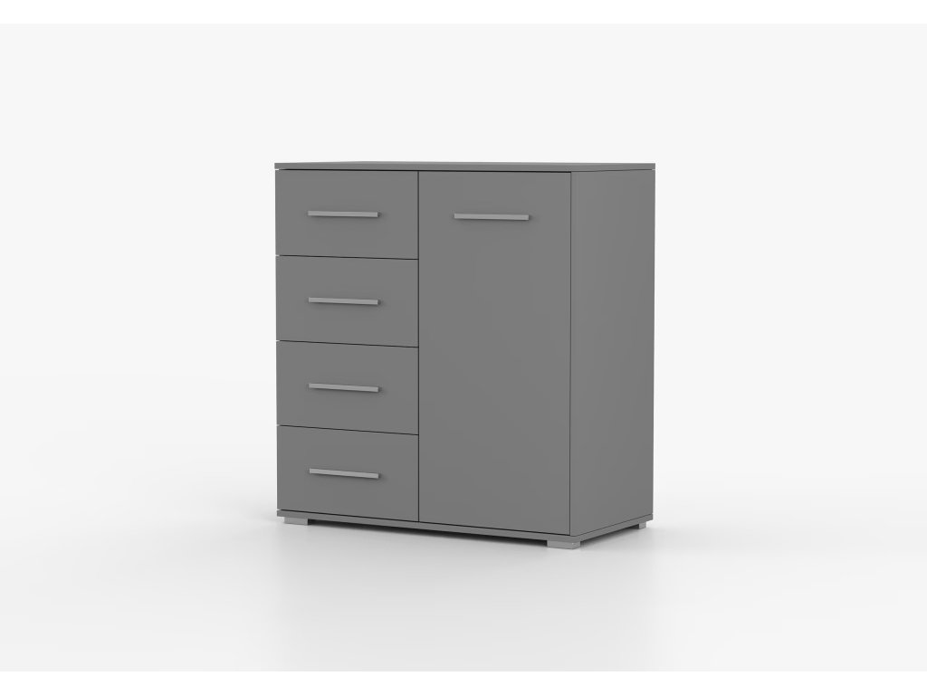 Šířka 90 cm, hloubka 45 cm, výška 96 cm. Praktická komoda s dvířky a 4 šuplíky, které mají velký úložný prostor. Komoda disponuje PVC úchytkami.