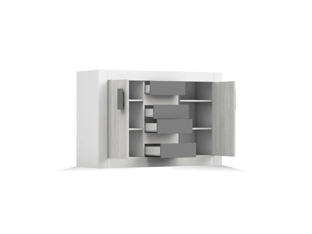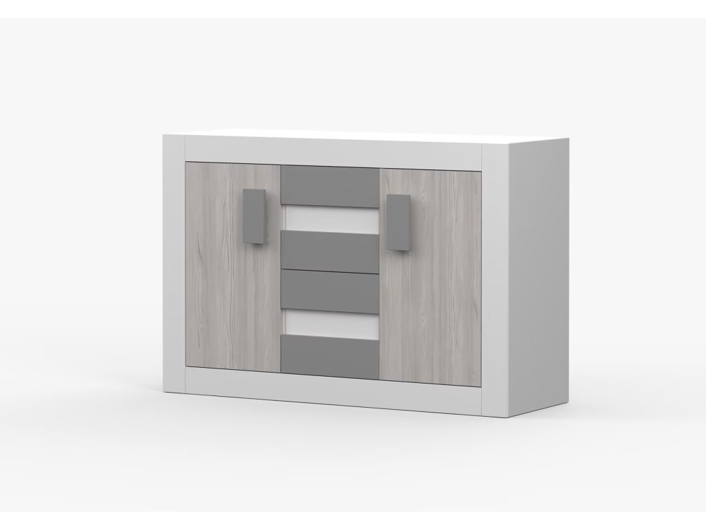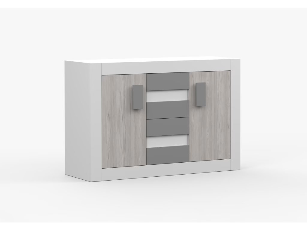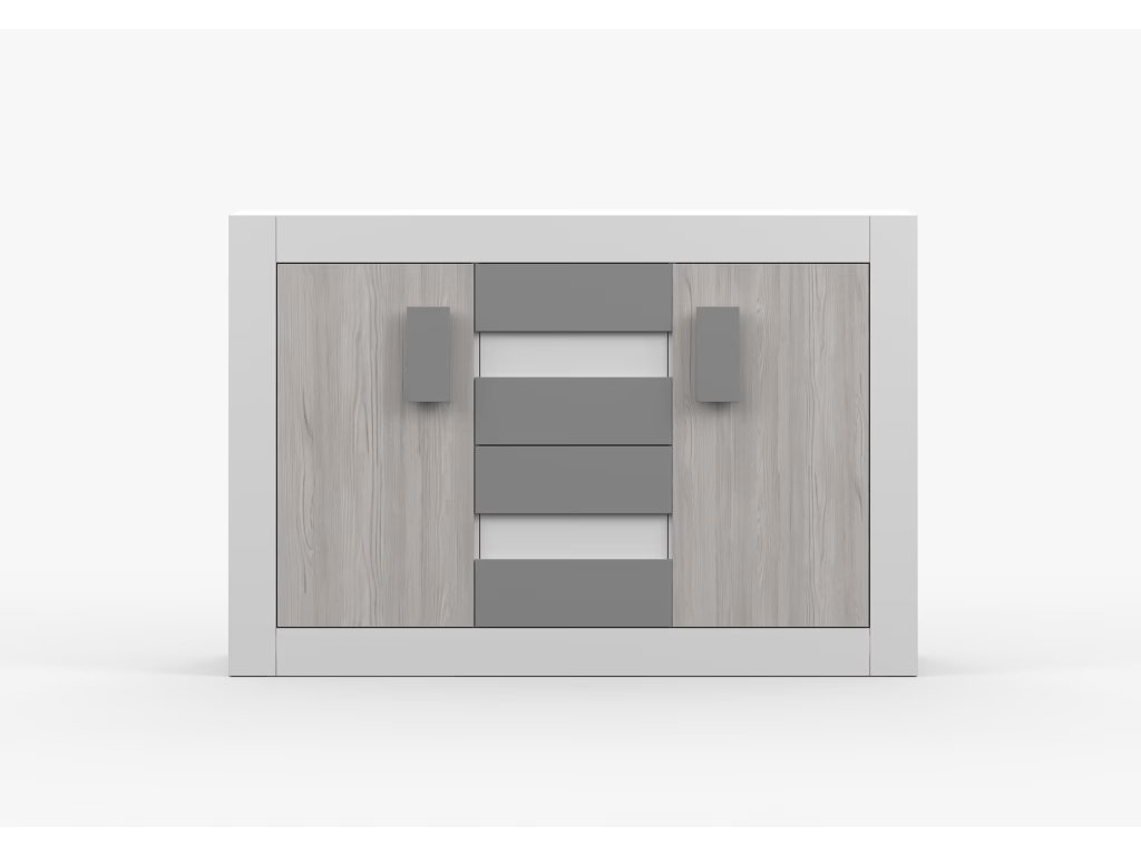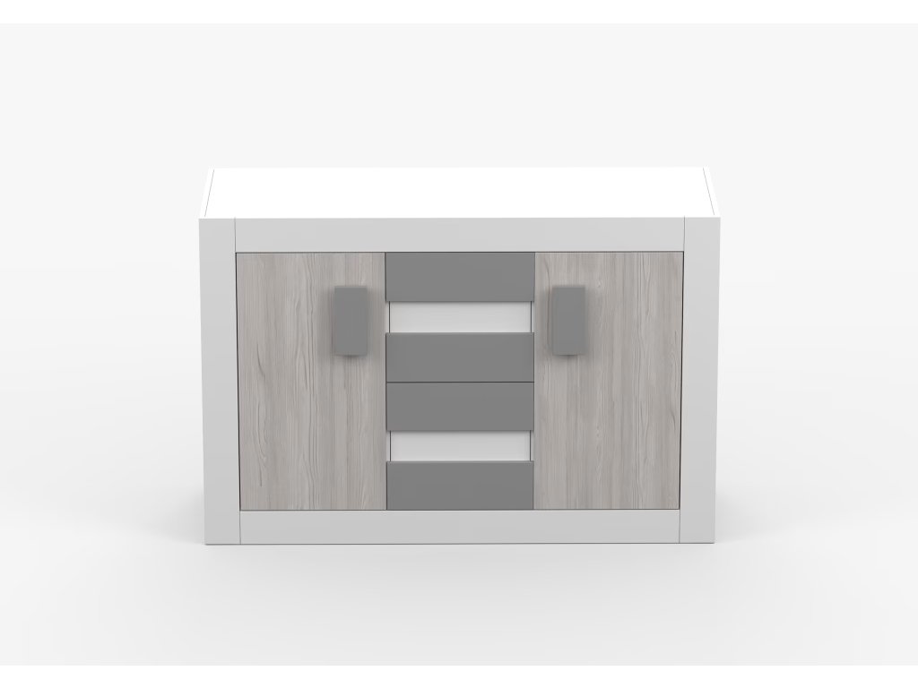 Šířka 145 cm, hloubka 50 cm, výška 96 cm. Minimalistická komoda s 4 šuplíky a 2 dvířky které mají velký úložný prostor. Komoda disponuje dřevěnými úchytkami a šedou vložkou.