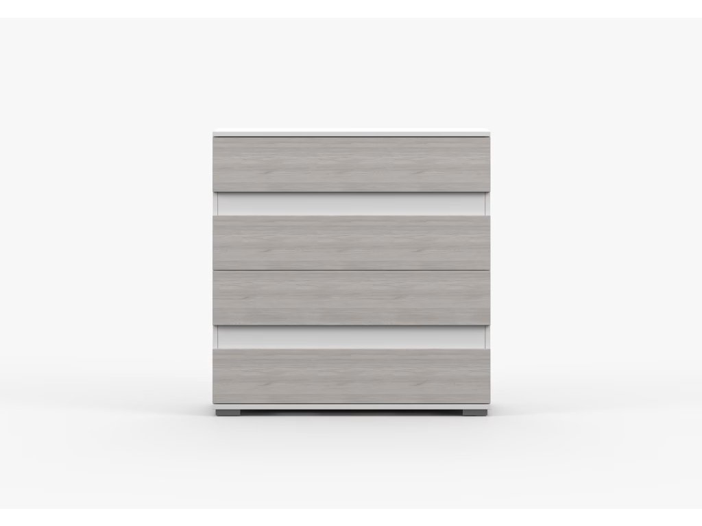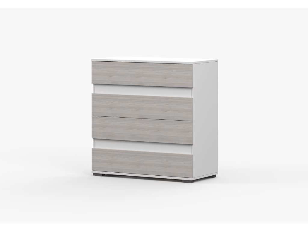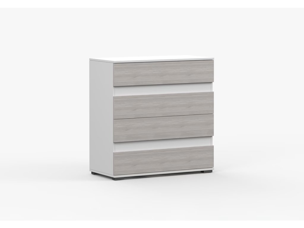 Šířka 90 cm, hloubka 43 cm, výška 93 cm. Minimalistická komoda s 4 šuplíky, které mají velký úložný prostor. Komoda disponuje dřevěnými úchytkami.