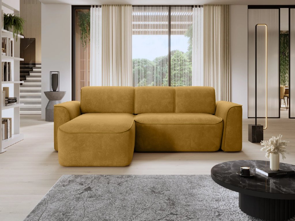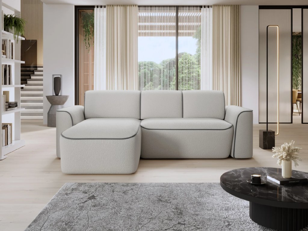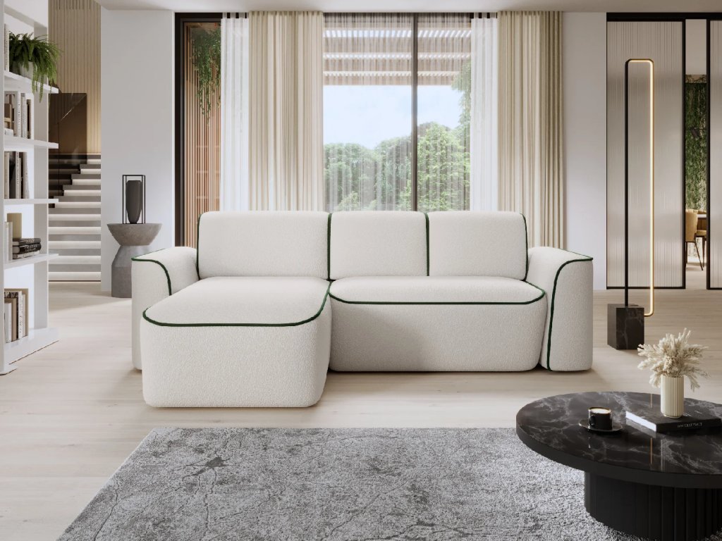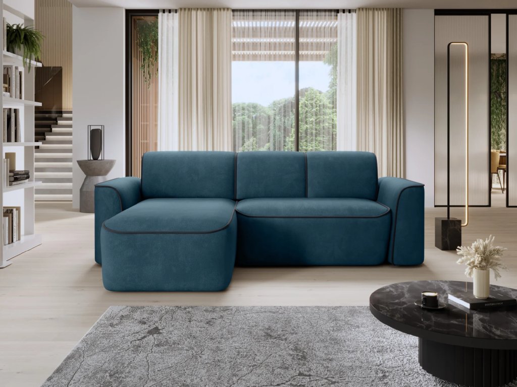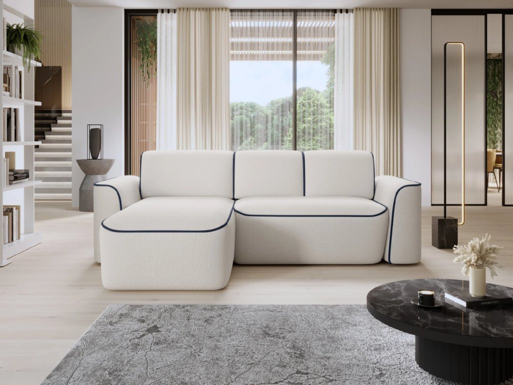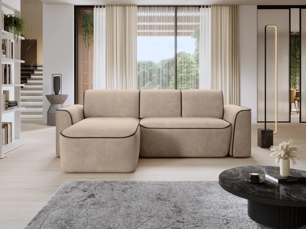 Estetika nábytku je stejně důležitá jako jeho funkčnost, a proto se vyznačuje kontrastním prošíváním. Pečlivě rozmístěné barevné akcenty dodávají celé kompozici charakter a eleganci a vytvářejí jemný akcent v designu nábytku. Díky těmto pečlivě vybraným detailům se rohová pohovka ve tvaru L stává nejen praktickým kusem nábytku, ale také stylovým prvkem interiérového designu. Rohová pohovka je vybavena funkcí spaní, která hostům vytvoří spací plochu pro přenocování. Čalouněná zadní strana umožňuje centrální expozici nábytku. Výrobek je k dispozici v levé a pravé verzi s funkcí spánku bez úložného prostoru.