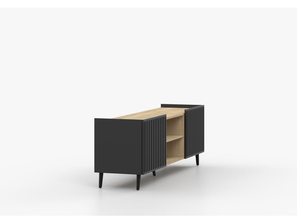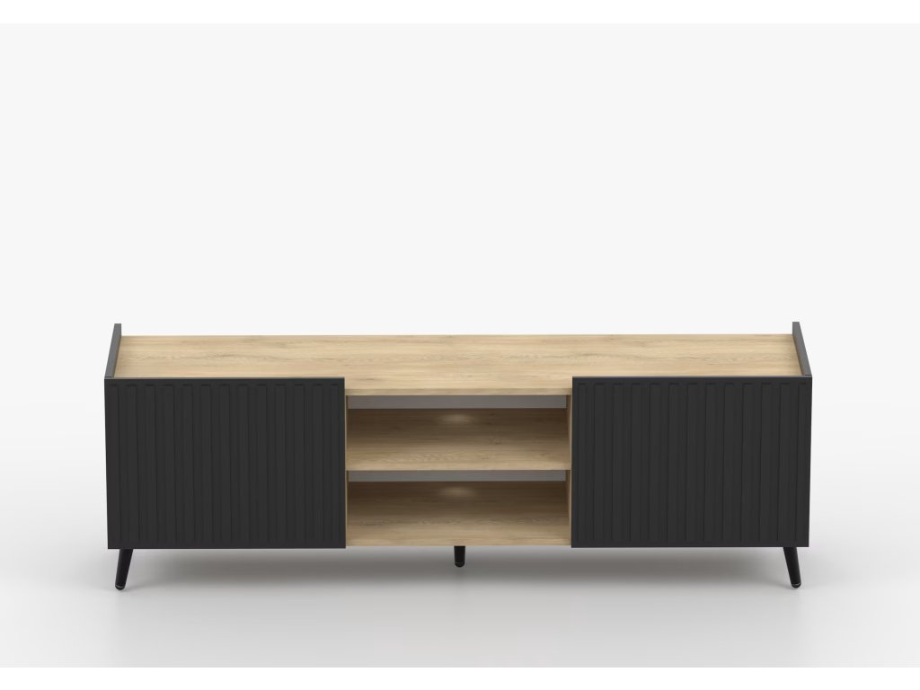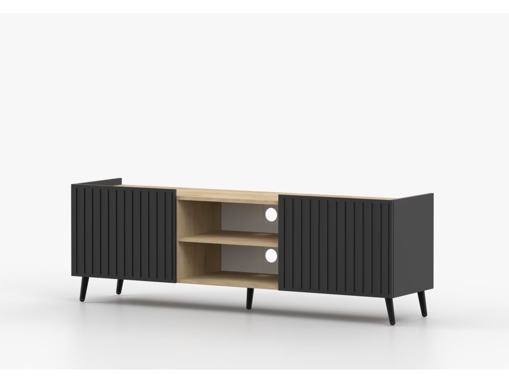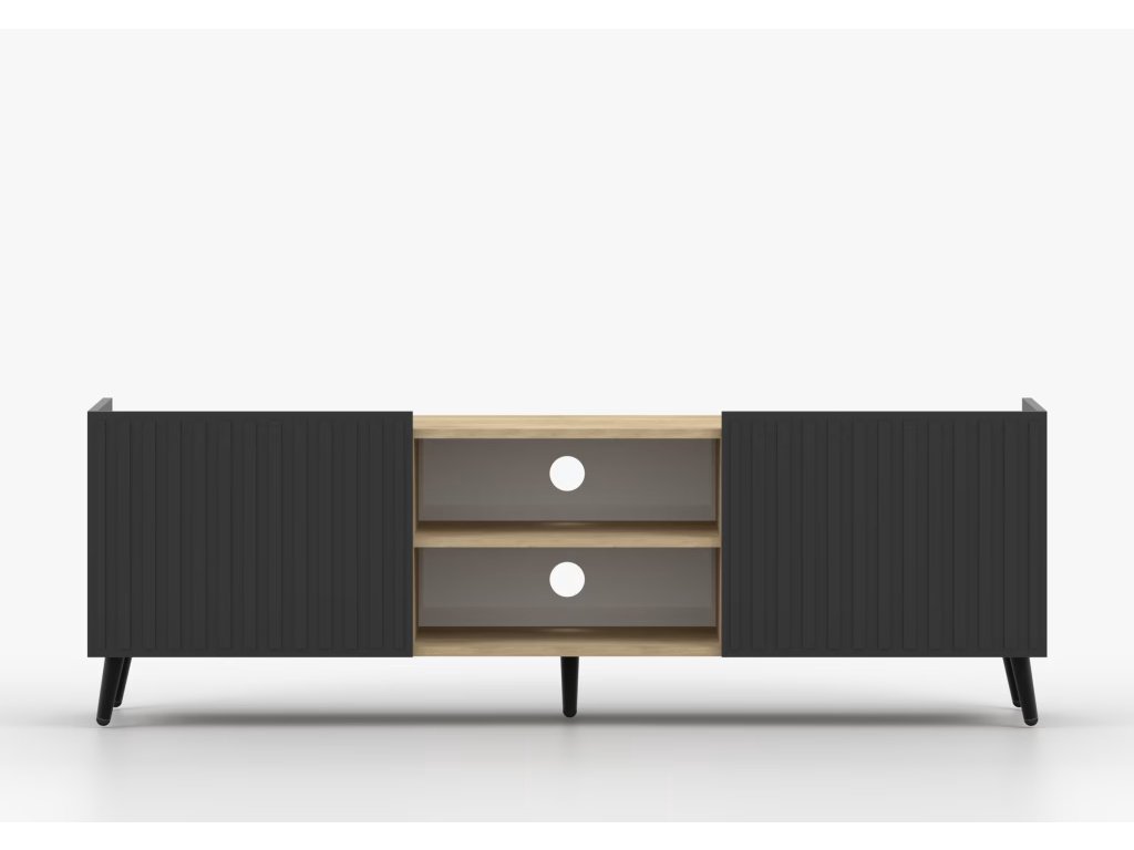Grady je ztělesněním elegance a funkčnosti v jednom. Černý tvar nábytku mu dodává rafinovaný charakter a zároveň zdůrazňuje minimalistický design. TV stolek Grady se skládá ze dvou skříněk a promyšleného výklenku pro RTV zařízení, což poskytuje ideální místo pro uložení a vystavení elektronických zařízení.