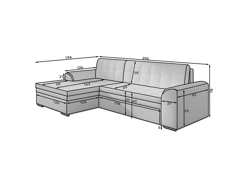 Šířka 296 cm, výška 78 cm, hloubka 194 cm. Moderní komfortní pohovka. Se spací plochou 262x128 cm, bez úložným prostorem. Výběr z mnoha barevných variant čalounění.