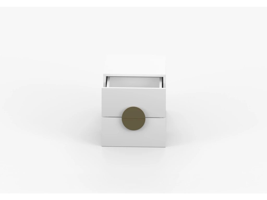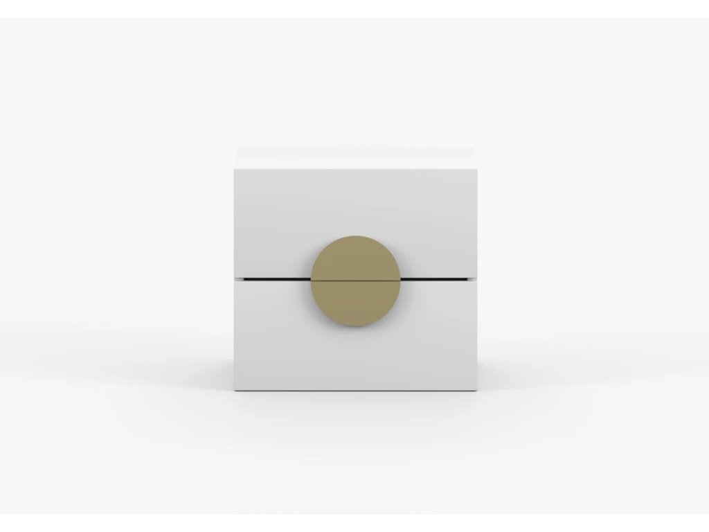 Zlatá úchytka zajistí snadné otevření přihrádky a zároveň svým designem barevně ladí s celkem nočního stolku. Celému stolku dodává elegantní design. Jeho laminovaná deska je odolná vůči poškrábání, poškození, vlhkosti a vysokým teplotám.