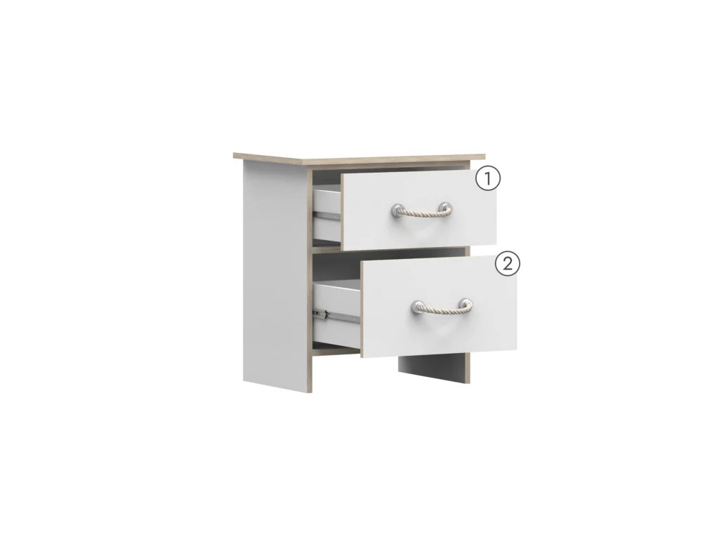 Šířka 54 cm, výška 63 cm, hloubka 42 cm. Větší noční stolek do ložnice s úložným prostorem v podobě dvou zásuvek a volného místa na odložení.