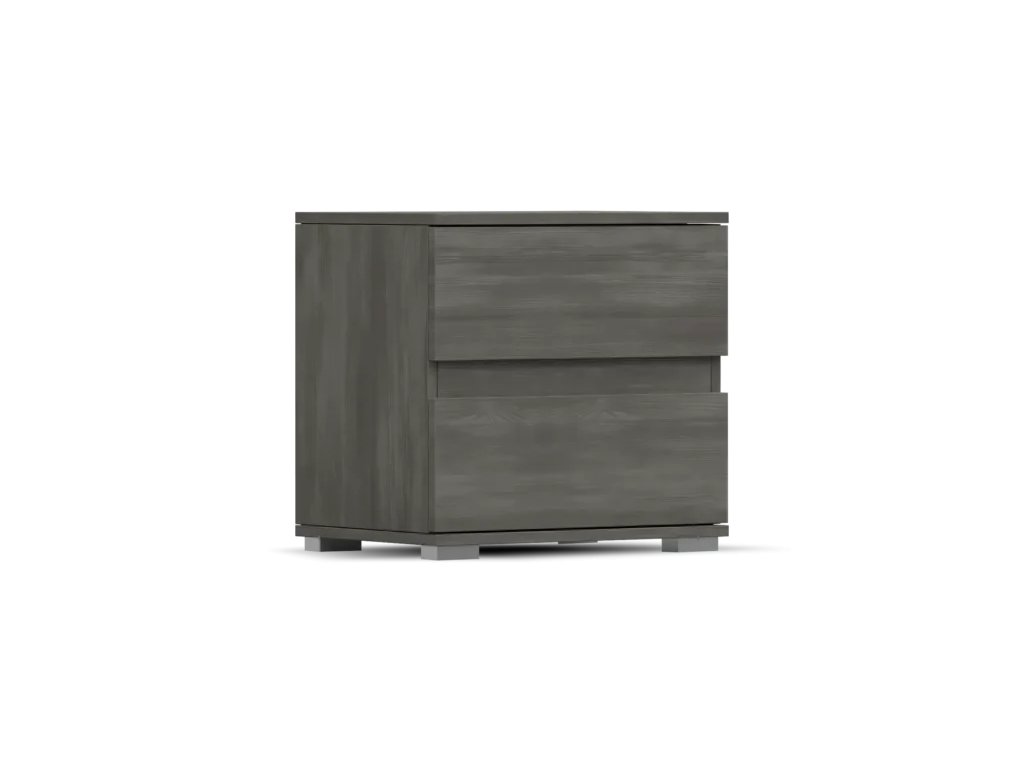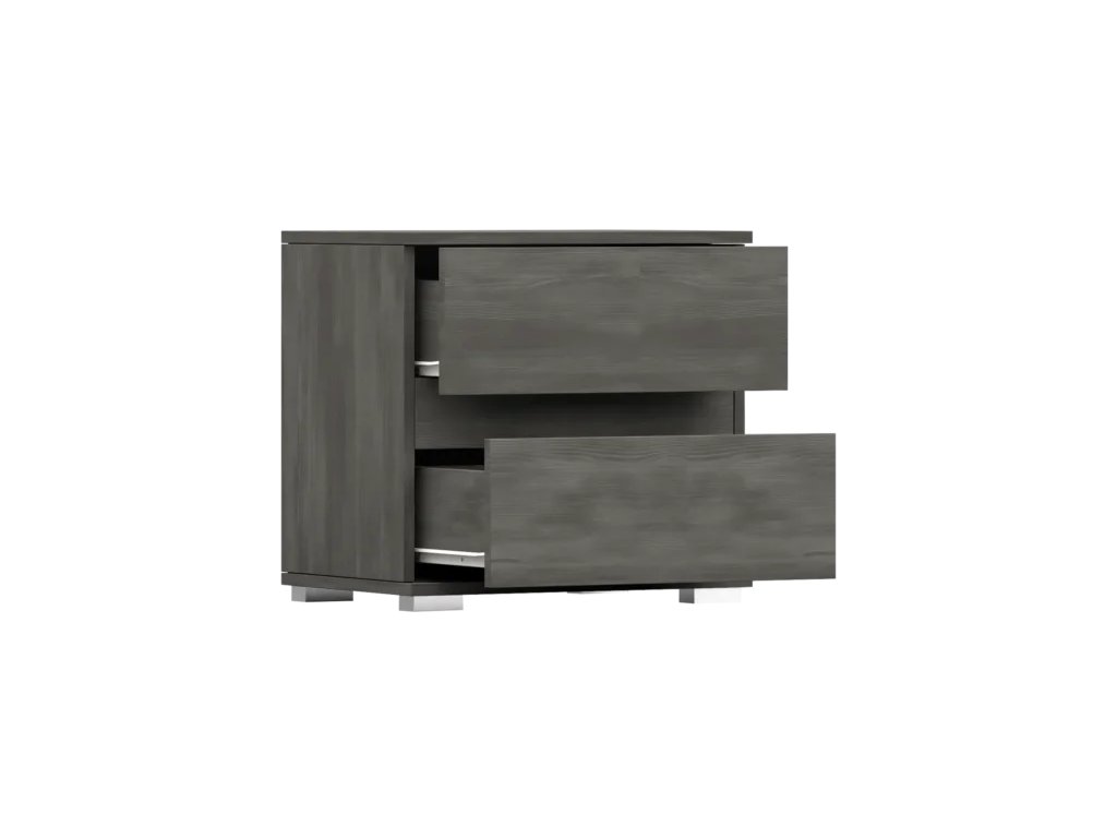Šířka 50 cm, výška 46 cm, hloubka 36 cm. Větší noční stolek do ložnice s úložným prostorem v podobě dvou zásuvek a volného místa na odložení.