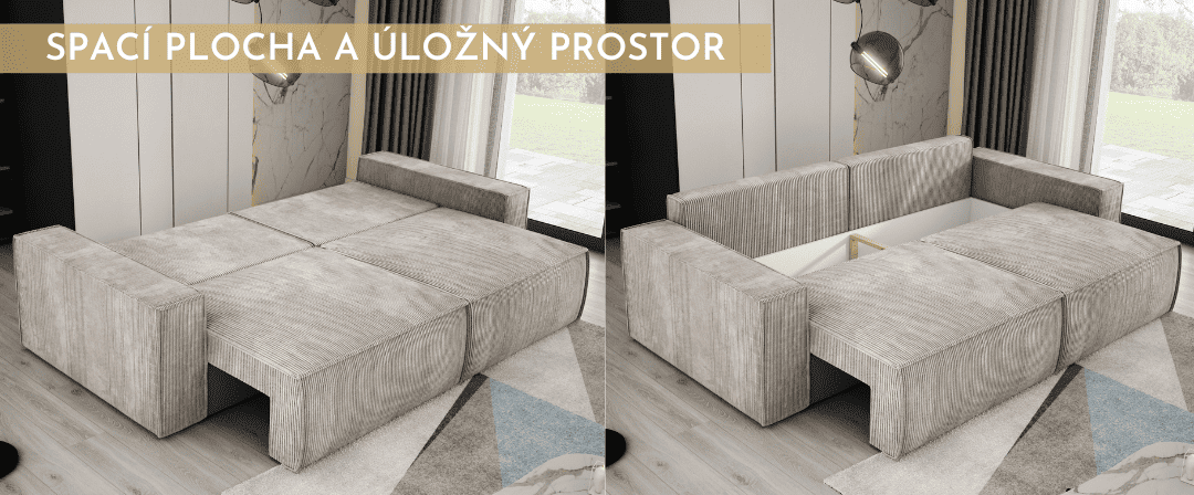 Pohovka je vybavena úložným prostorem a funkcí spaní, kterou lze rozložit pomocí kluzáků - stačí lehce nadzvednout sedací část a posouvat ji směrem k sobě, aby se pohovka rozložila. Další výhodou jsou čalouněná záda umožňující vystavení nábytku do středu místnosti.
