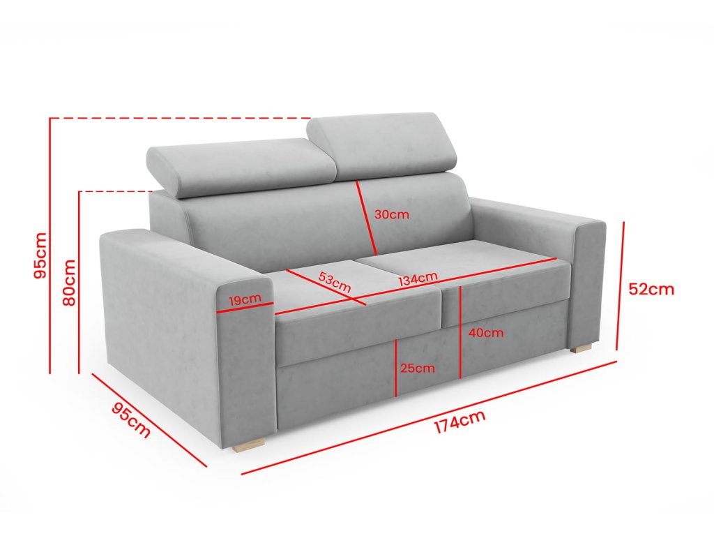 Šířka 174 cm, výška 95 cm, hloubka 95 cm. Bez spací plochy. Moderní komfortní pohovka. Bez úložného prostoru. Výběr z mnoha barevných variant čalounění.
