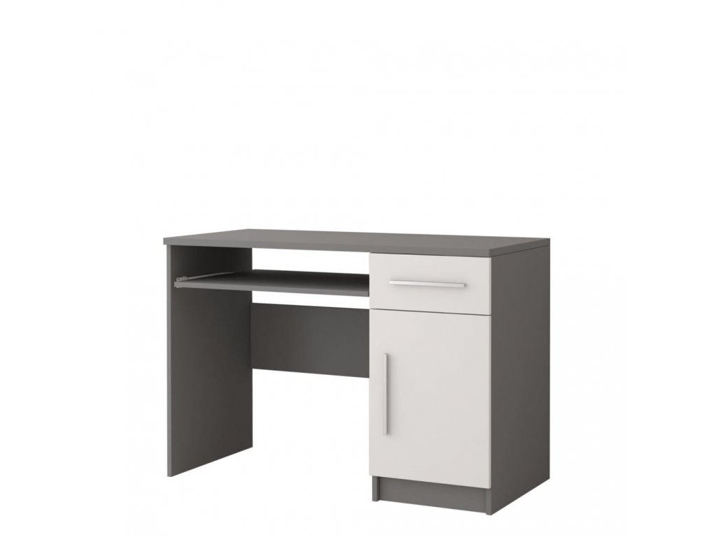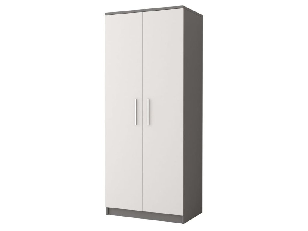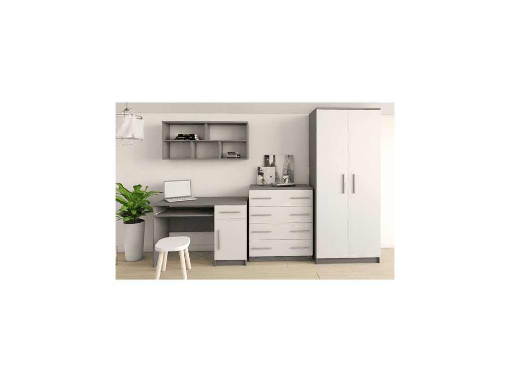 Elegantní pokojová sestava v dekoru šedá/bílá je tvořena stolem se závěsnou policí, komodou a šatní skříní, u které máte na výběr ze dvou velikostí. Za příplatek si můžete dokoupit postel nebo noční stolek.
