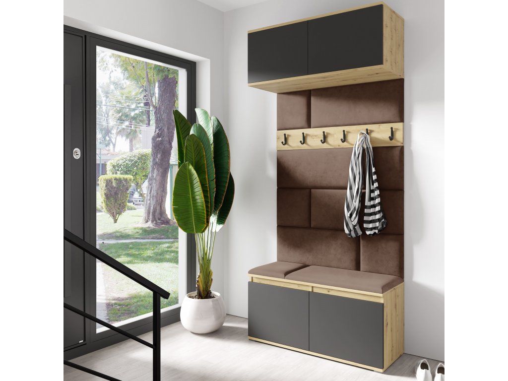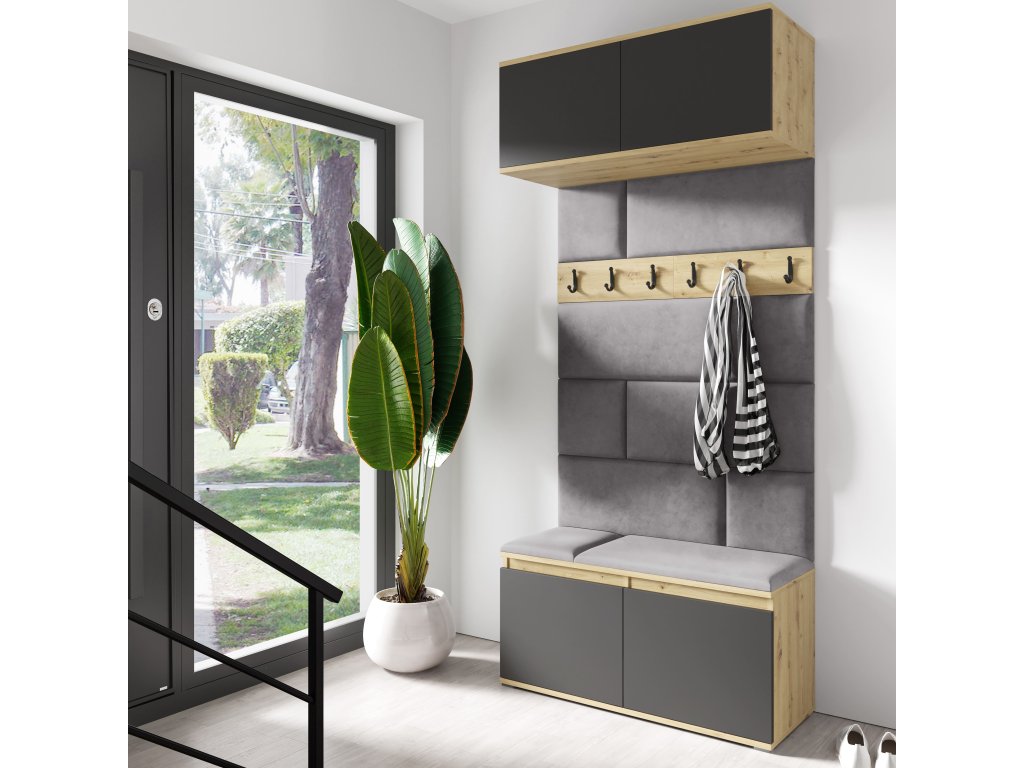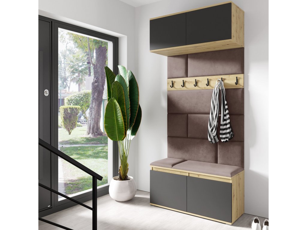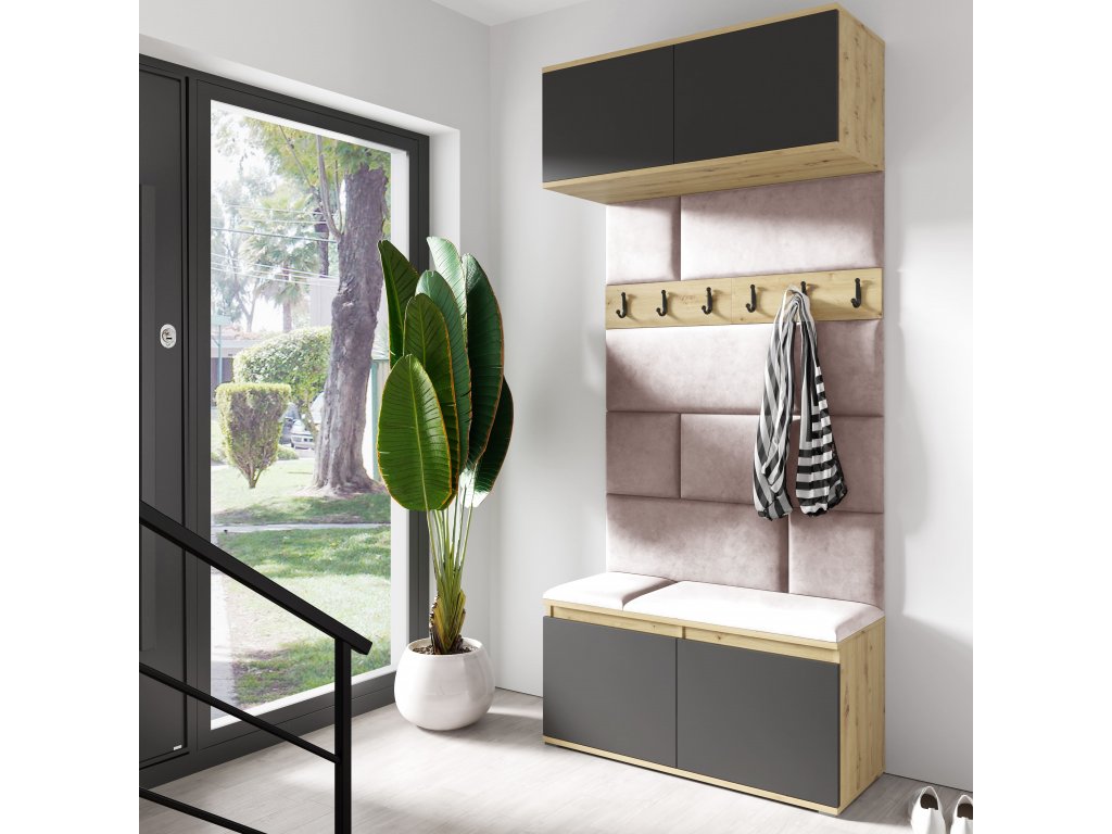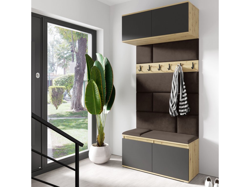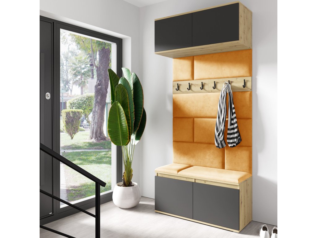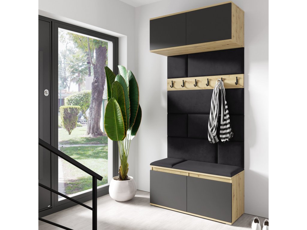 Tato nevšední předsíňová stěna nabízí moderní vzhled díky kombinaci barev artisan/černá, doplněné barevnými čalouněnými panely, nástěnným věšákem a závěsnou skříní.