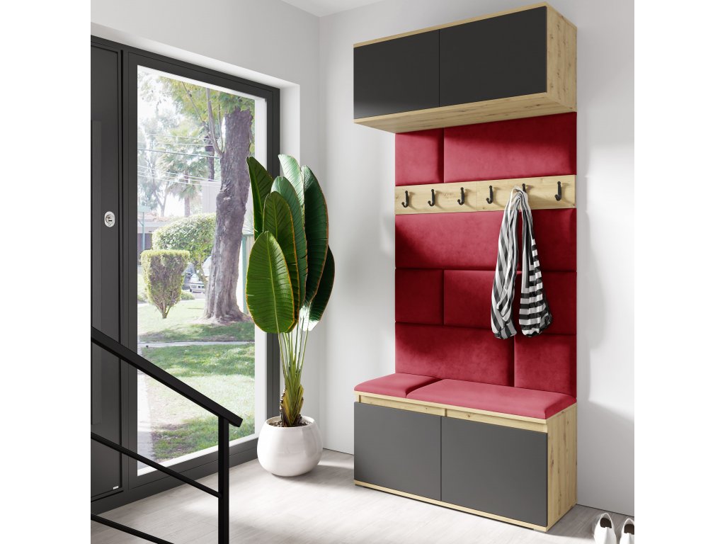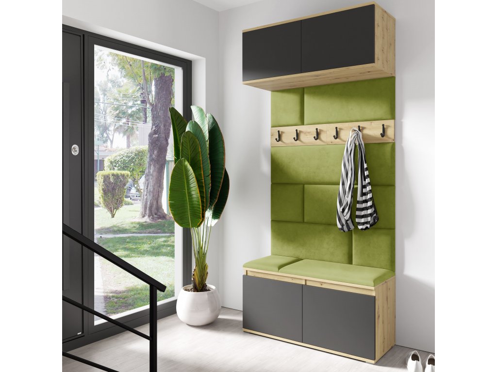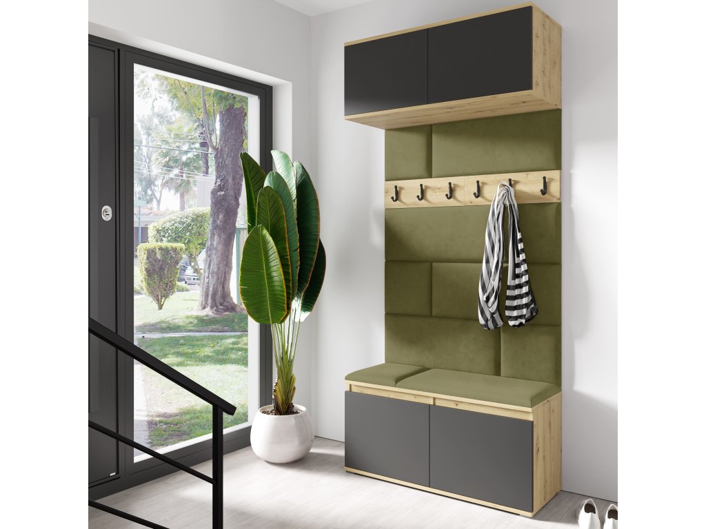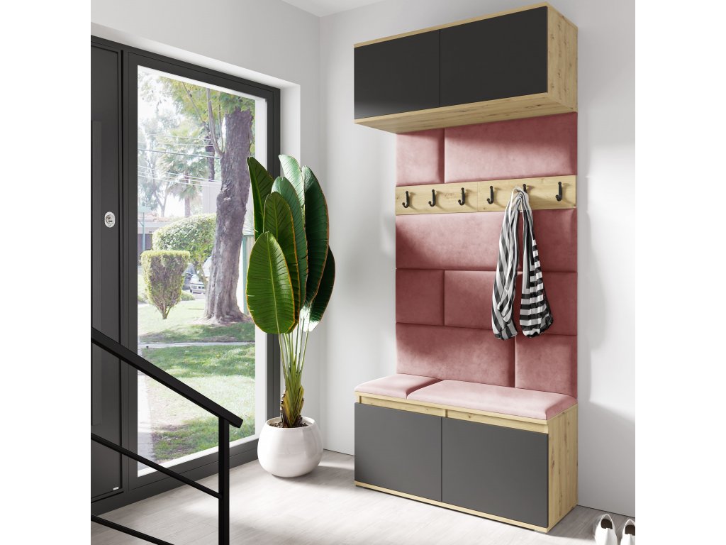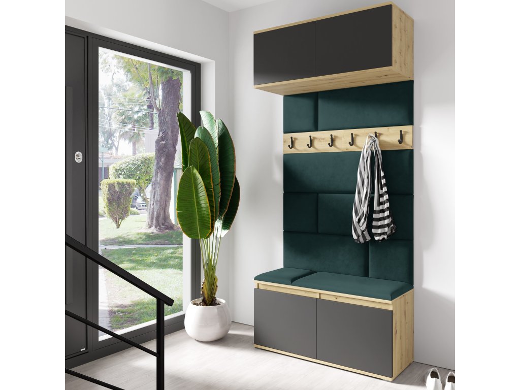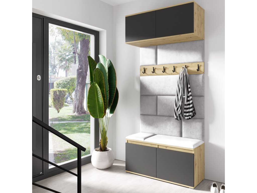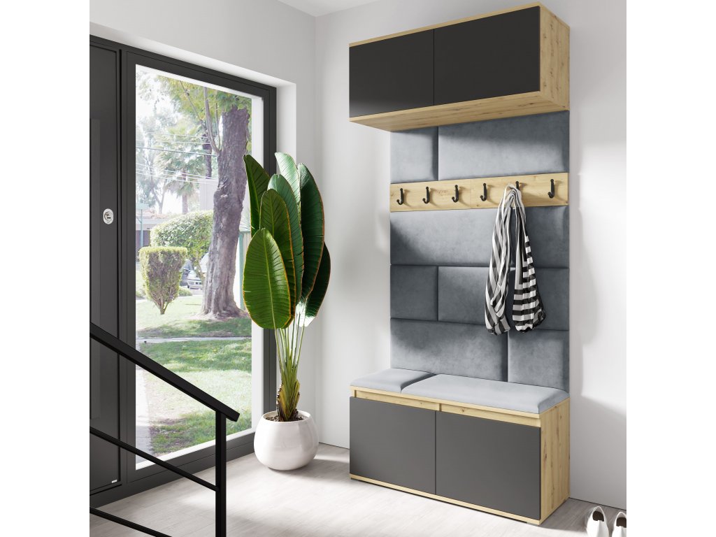 Tato nevšední předsíňová stěna nabízí moderní vzhled díky kombinaci barev artisan/černá, doplněné barevnými čalouněnými panely, nástěnným věšákem a závěsnou skříní.