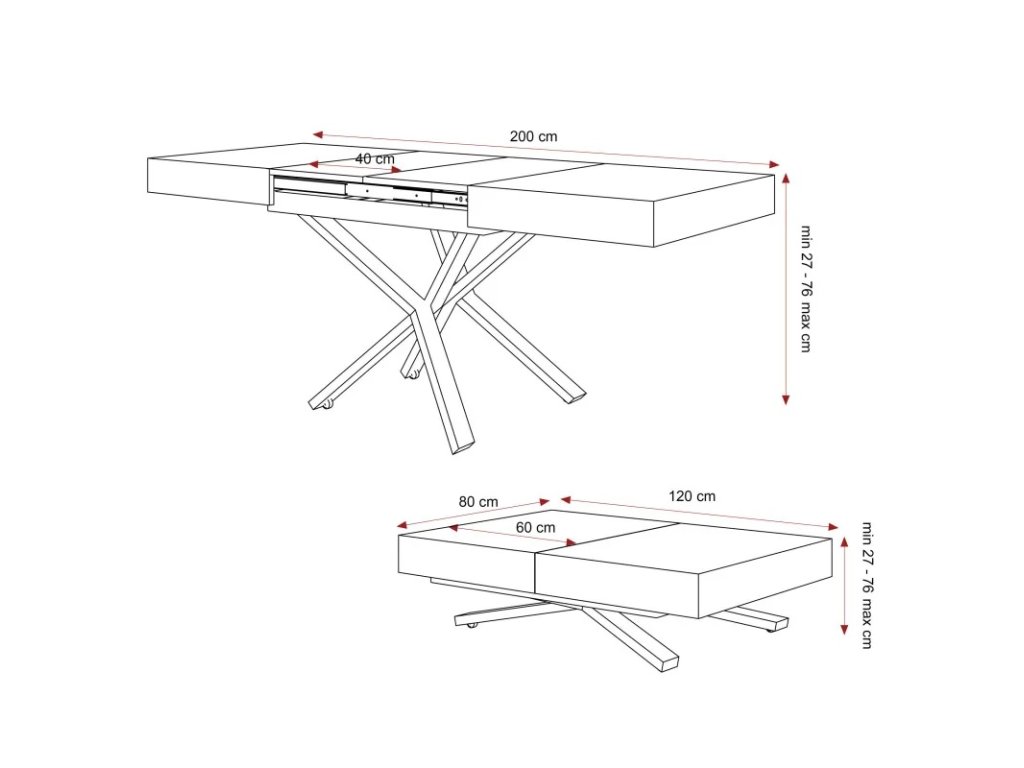Délka 120 cm, šířka 80 cm, výška 27 - 76 cm. Moderní konferenční stolek v šesti barevných variantách s praktickou funkcí rozkládání.