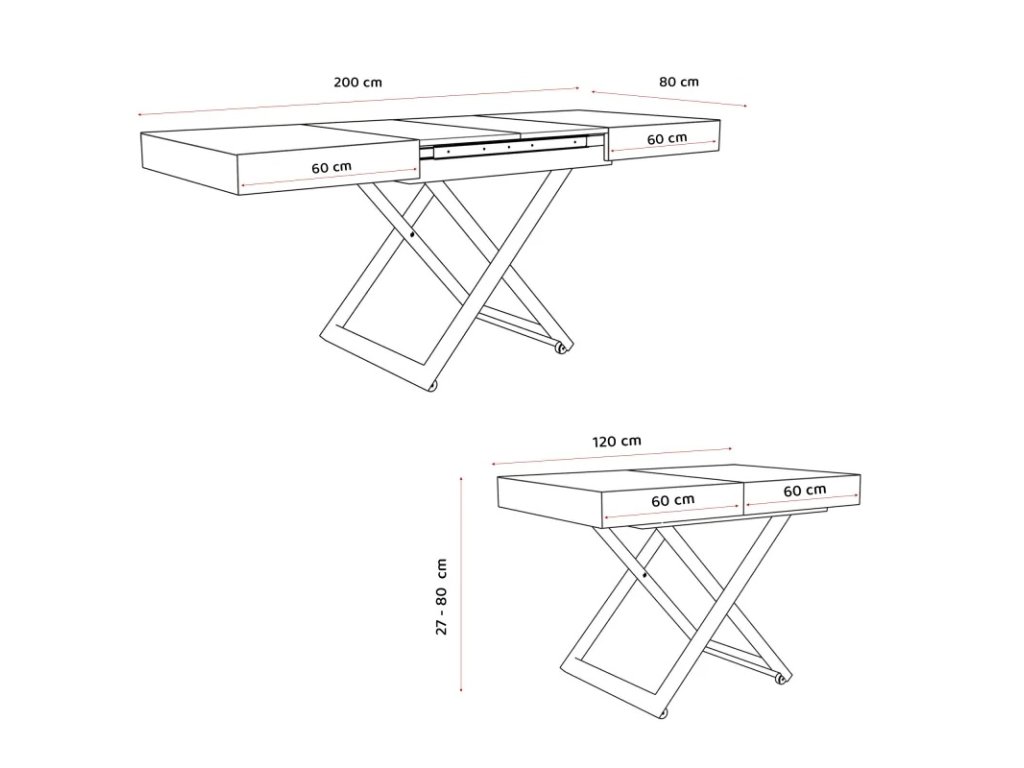 Délka 120 cm, šířka 80 cm, výška 27 - 80 cm. Moderní konferenční stolek v šesti barevných variantách s praktickou funkcí rozkládání.