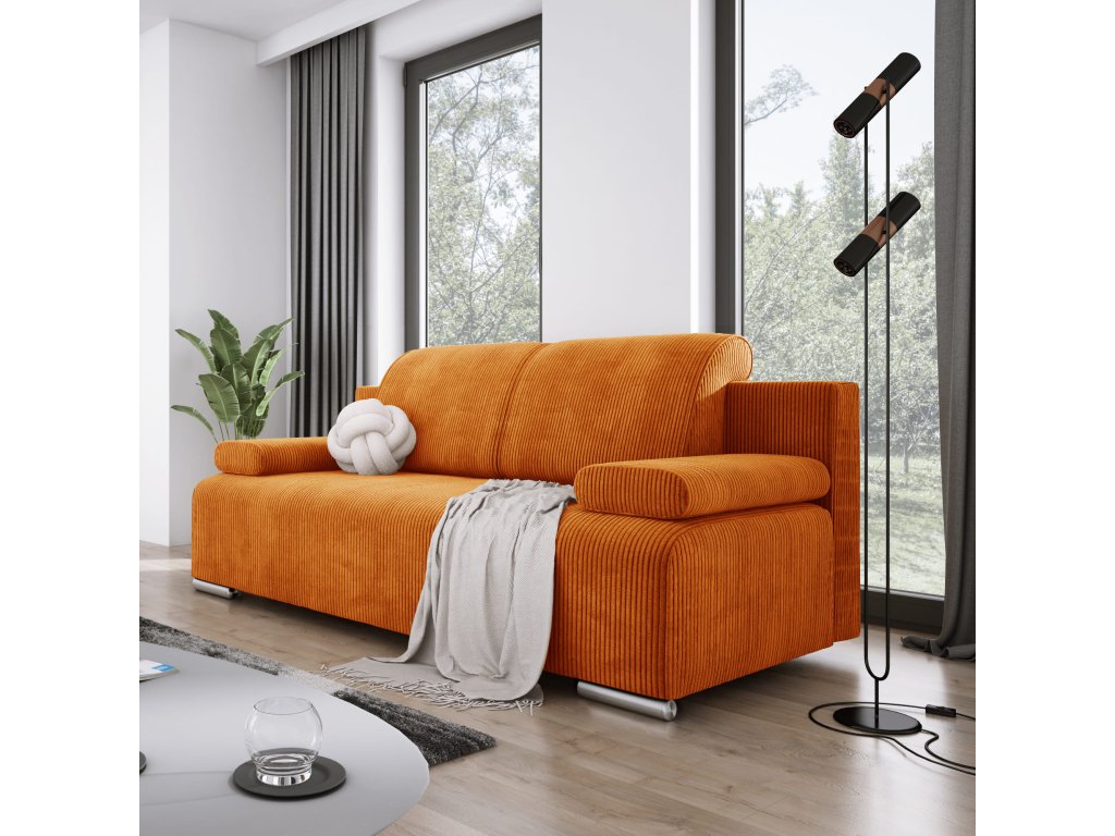 Pohovka je vybavena funkcí spaní, kterou lze rozložit pomocí kluzáků - stačí lehce nadzvednout sedací část a posouvat ji směrem k sobě, aby se pohovka rozložila. Další výhodou jsou čalouněná záda umožňující vystavení nábytku do středu místnosti.