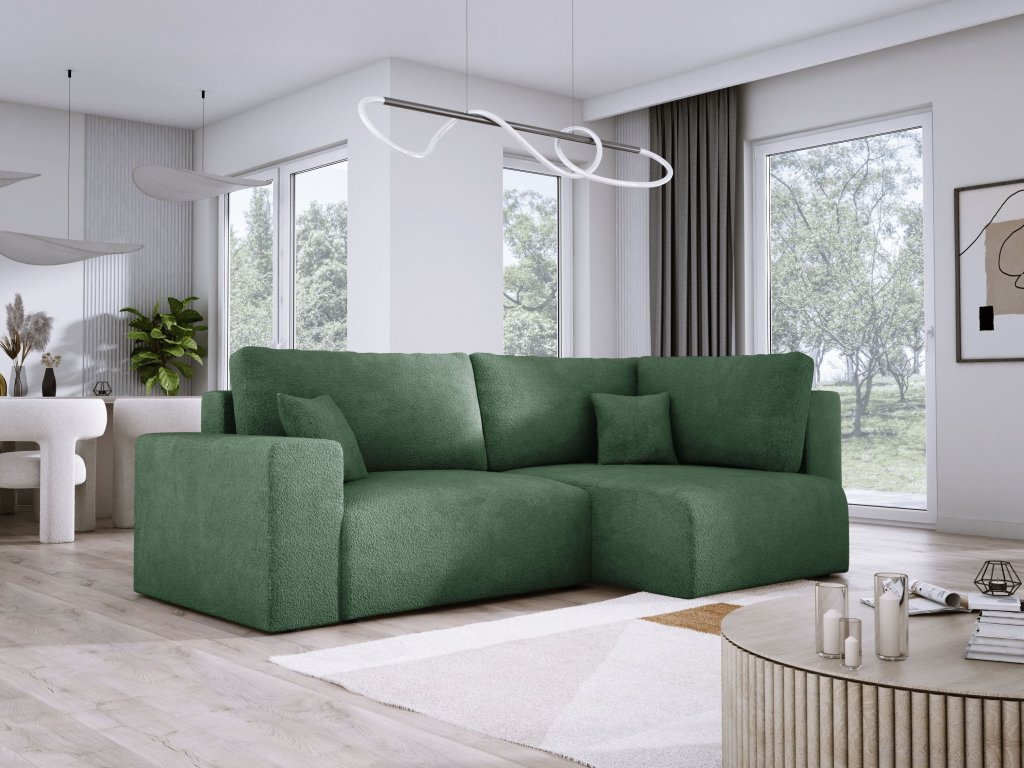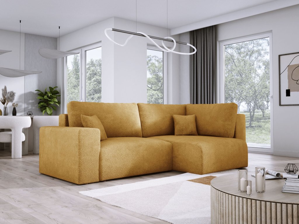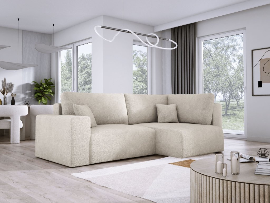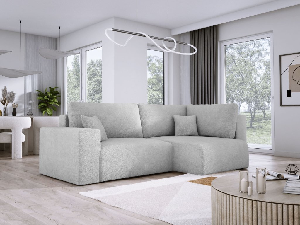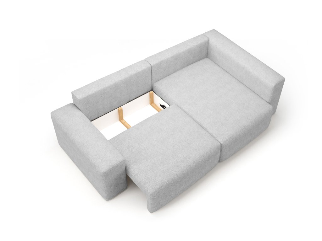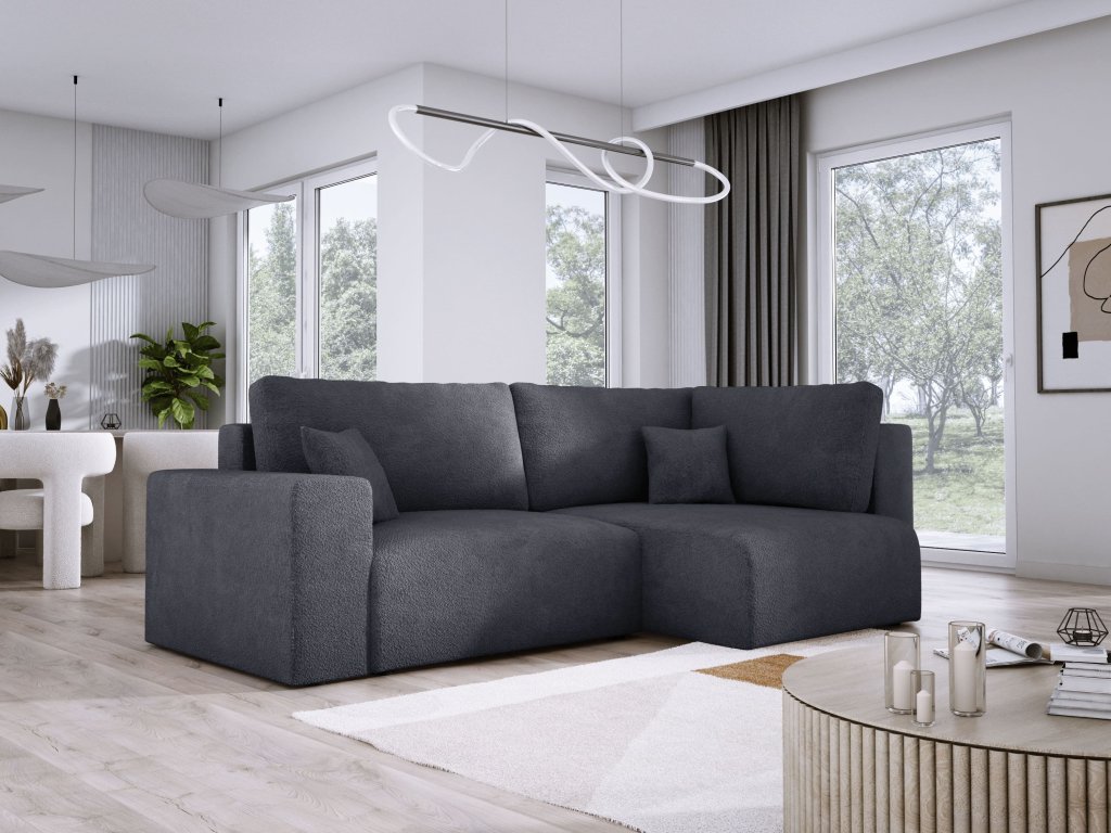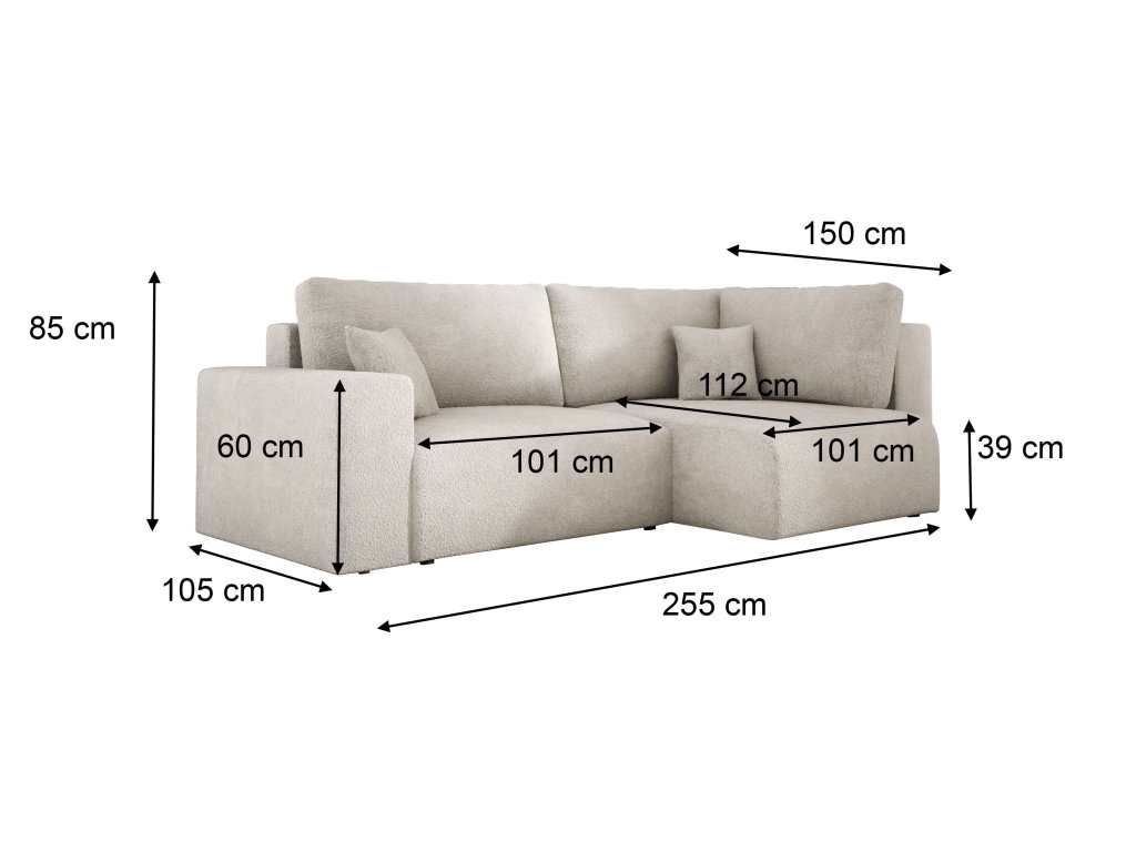 Malá rohová sedačka s funkcí spaní Dylan je ideální pro lidi, kteří hledají něco nového. Charakteristická látka, připomínající ovčí vlnu, dodá obývacímu pokoji nový, jedinečný akcent. Prezentovaný model je vybaven funkcí spaní (spací plocha 135x205 cm) a prostorným úložným prostorem na lůžkoviny, díky čemuž má velmi praktický tvar. To vám umožní v případě potřeby ubytovat hosty přes noc. Součástí sady jsou i polštáře s povlaky zapínanými na zip, které fungují jako opěrka zad.