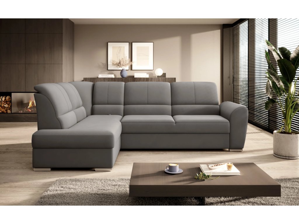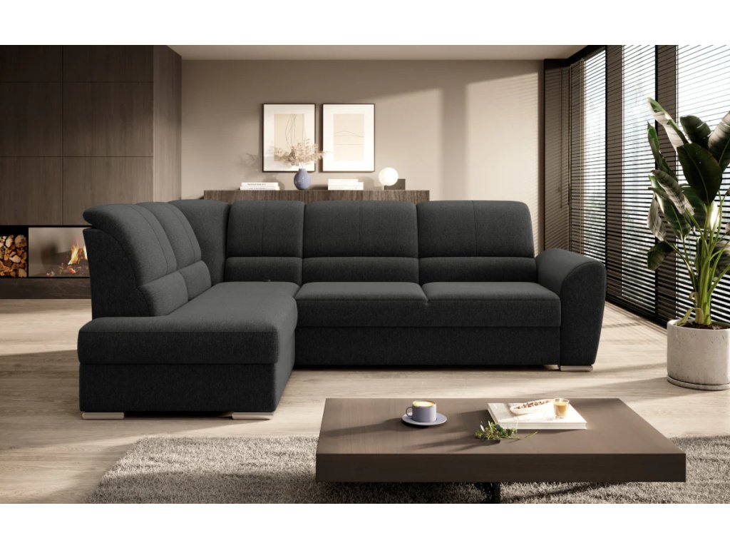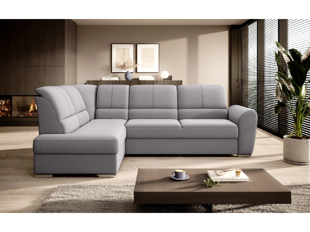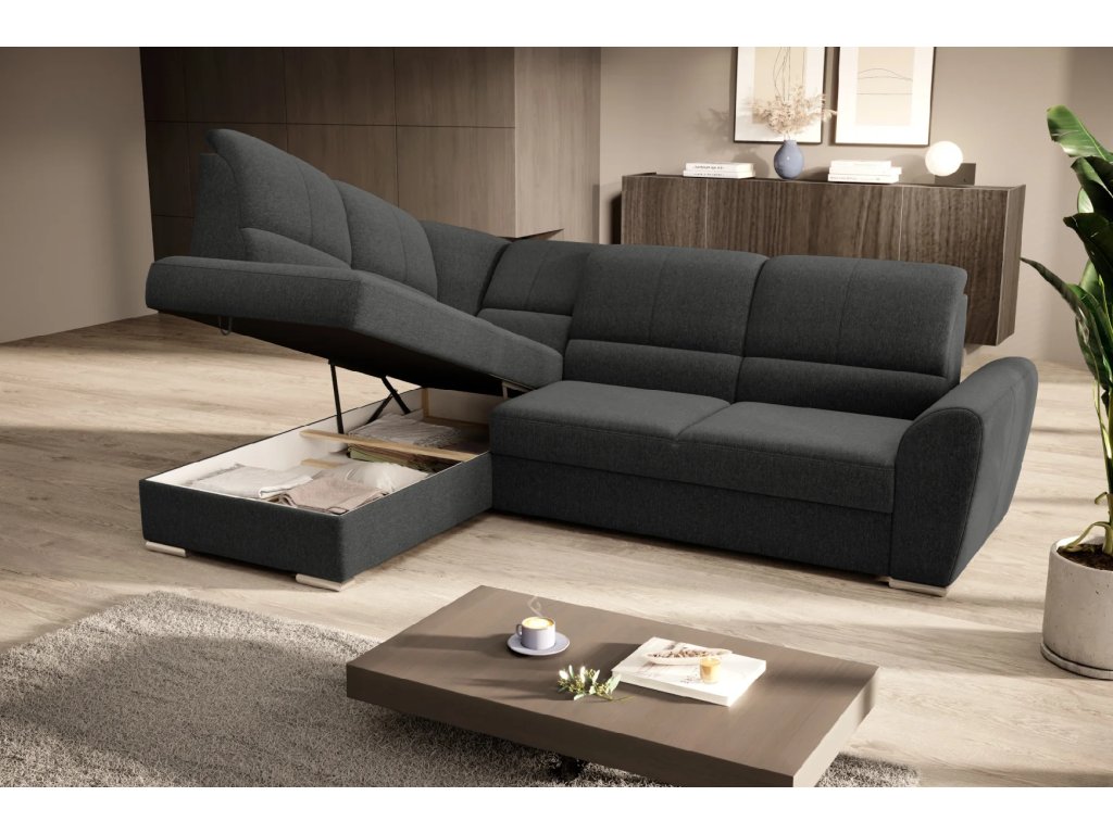 Šířka 270 cm, výška 93 cm, hloubka 186 cm. Spací plocha 205 x 125 cm. Praktická a moderní sedací souprava do tvaru L. Rozkládací mechanismus s úložným prostorem. Opěrky hlavy a zad. Výběr z mnoha barevných variant čalounění. V pravé i levé orientaci rohu.