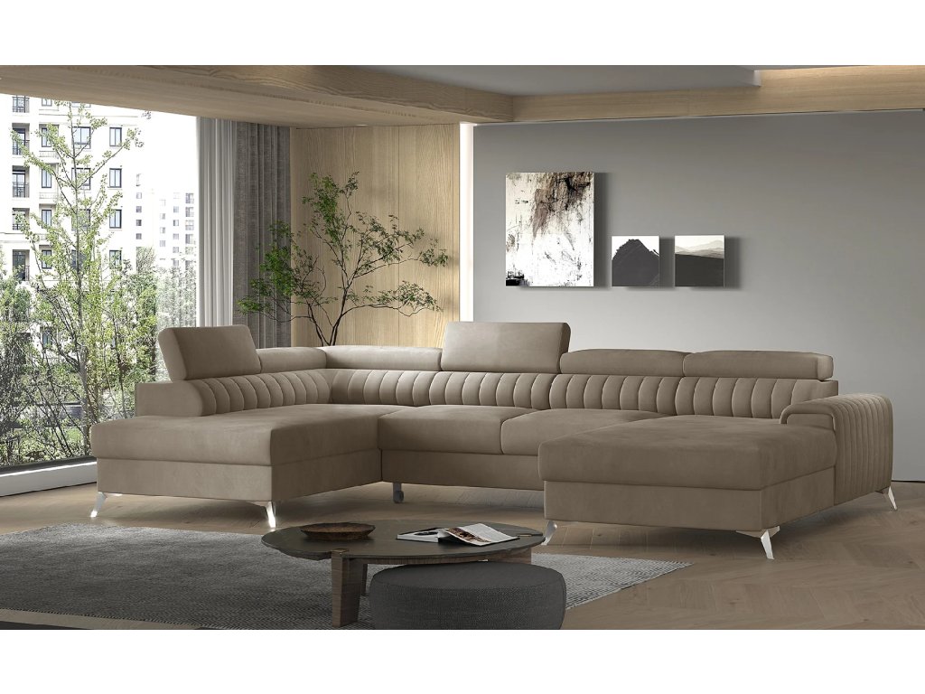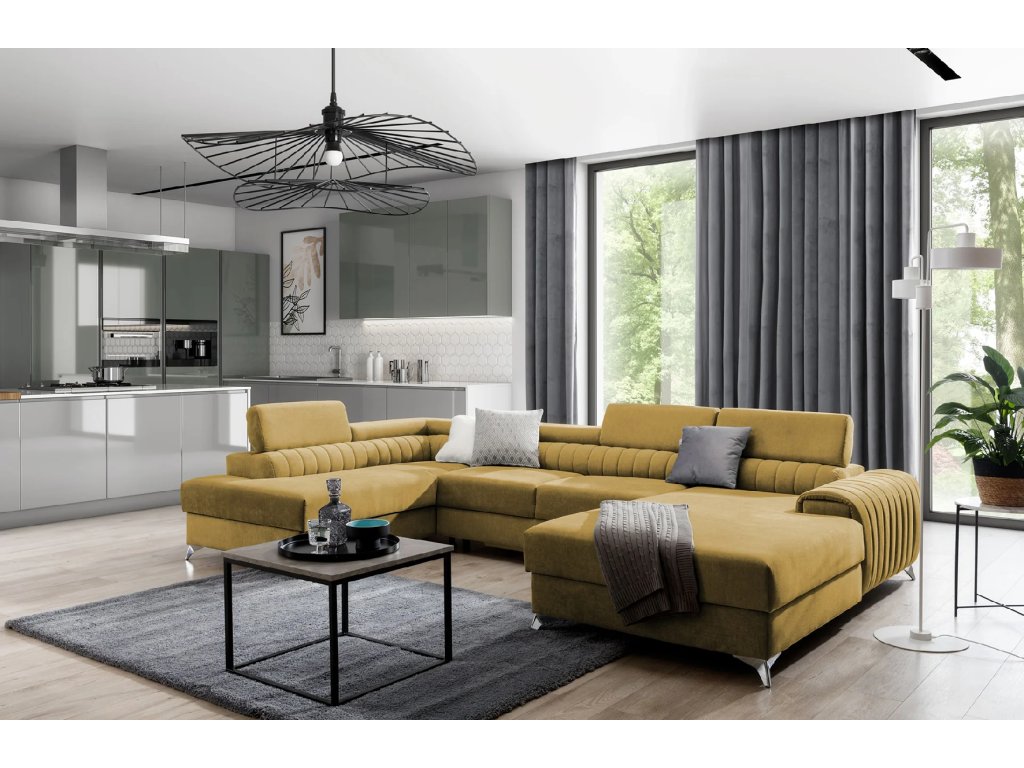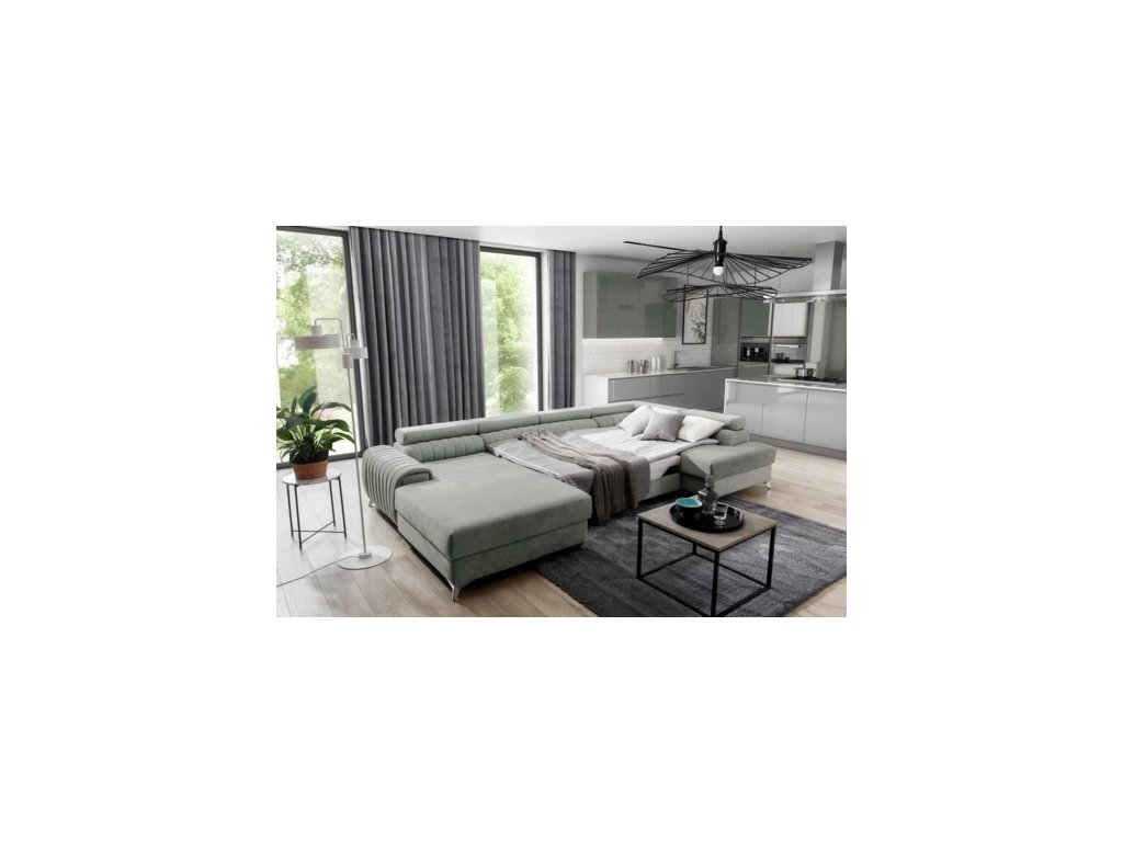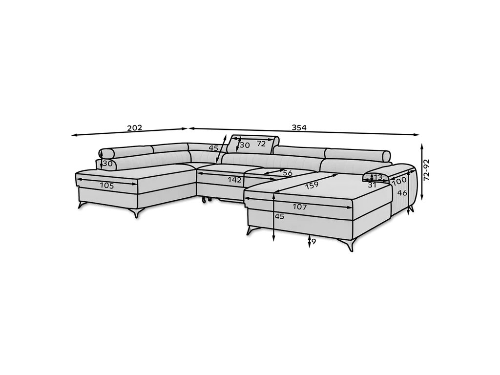 Šířka 354 cm, výška 72-92 cm, hloubka 202 cm. Spací plocha 265 x 123 cm. Útulná a pohodlná sedací souprava do tvaru U s úložným prostorem a rozkládacím mechanismem. Výběr z mnoha barevných variant čalounění.
