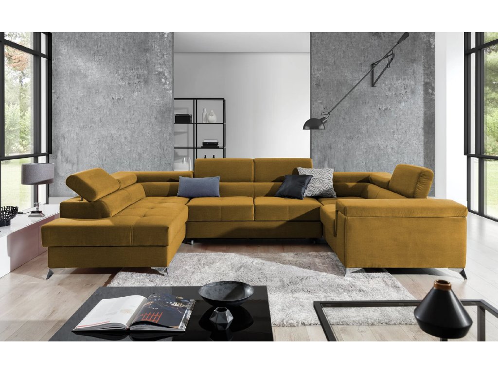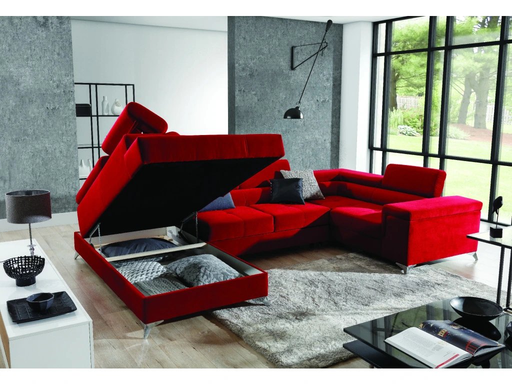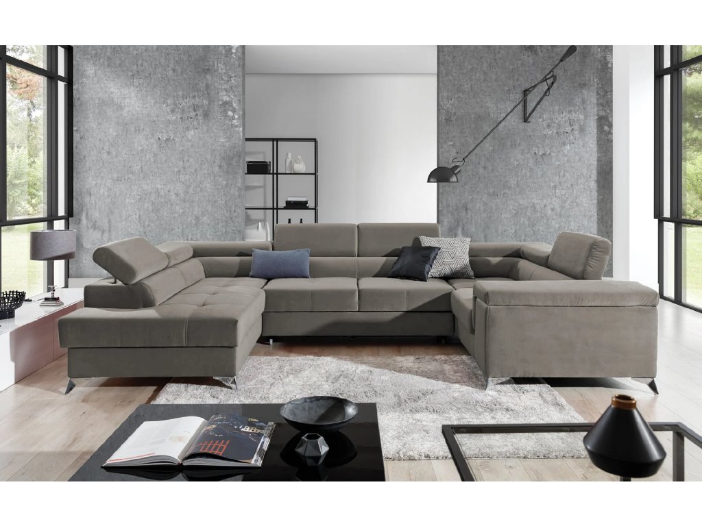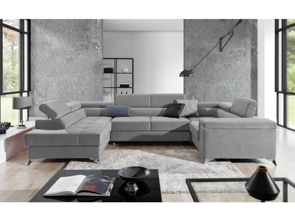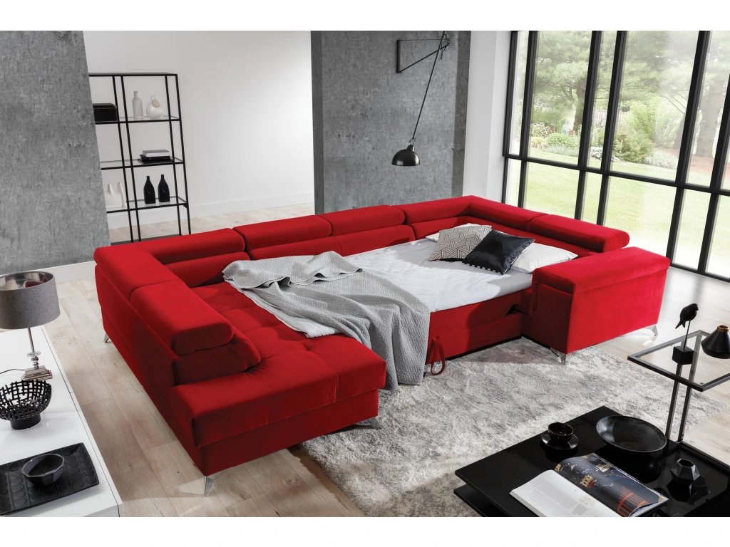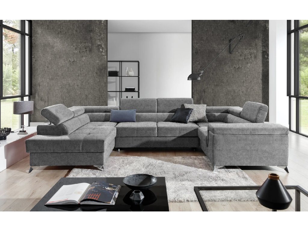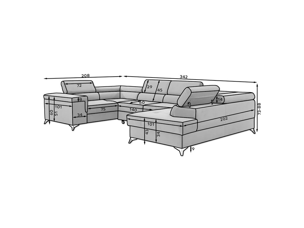 Šířka 342 cm, výška 73 - 88 cm, hloubka 208 cm. Spací plocha 256x124 cm. Všestranná sedačka do tvaru U. Rozkládací mechanismus s úložným prostorem. Výběr z mnoha barevných variant čalounění. V pravé i levé orientaci rohu.