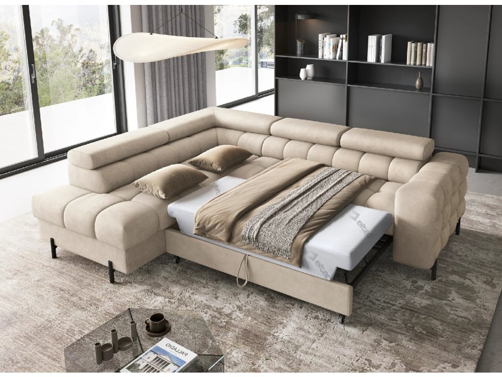 Nastavitelné opěrky hlavy ještě více umocní pocit pohody. Naštěstí má funkci spánku Dolphin, která se intuitivně používá. To znamená, že pohovku snadno proměníte v pohodlnou postel. Sedačku doplňuje úložný prostor na ložní prádlo se zvedacím mechanismem. Sedačka má menší kovové nožičky o velikosti 9 cm. Dále se dá k sedačce dokoupit praktický taburet s úložným prostorem. Sedačka je dostupná v široké škále látek.