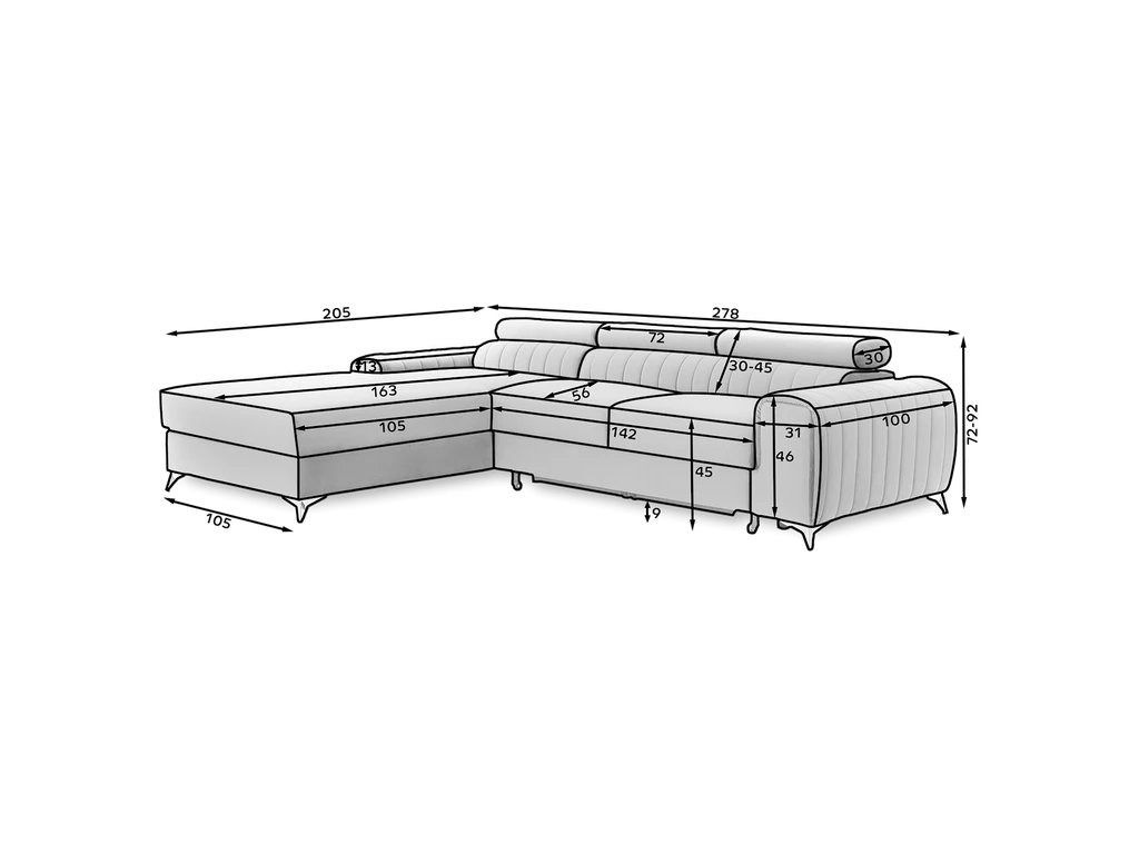Šířka 278 cm, výška 72-92 cm, hloubka 100 - 205 cm (delší strana). Moderní komfortní pohovka. Se spací plochou 216x125 cm a úložným prostorem. Výběr z mnoha barevných variant čalounění.
