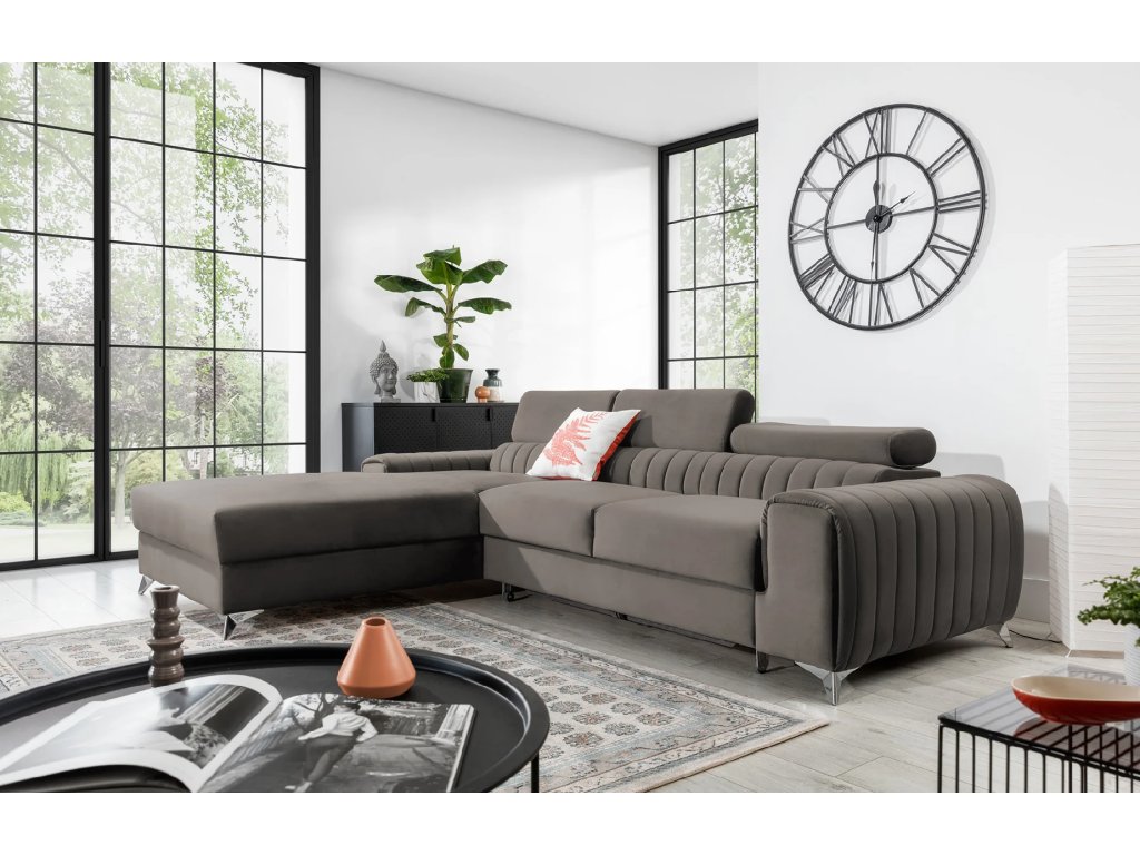 Hledáte pohodlný a stylový kus nábytku do obývacího pokoje? Objevte rohovou pohovku Geretth, perfektní doplněk do každého rodinného domu! Pohodlí je u rohové pohovky Geretth klíčové. Sedák o rozměrech 278 x 205 x 92 centimetrů je vyroben mimo jiné ze spolehlivé pěny T30+HR , která zvyšuje jeho elasticitu a odolnost. Design doplňují opěrky hlavy a opěradla vyplněné měkkou polyuretanovou pěnou T2130.