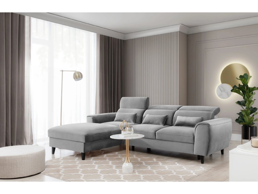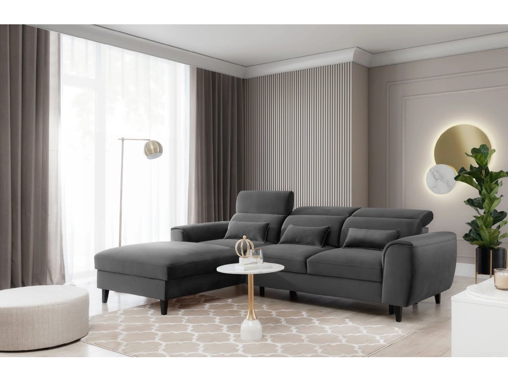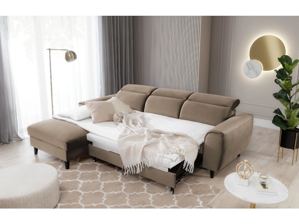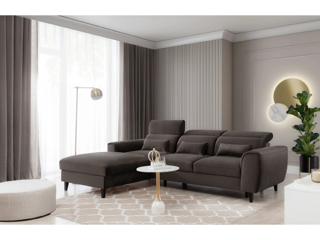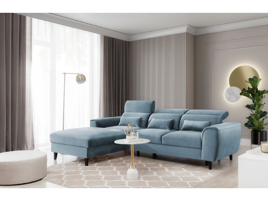 Pro zajištění maximální bezpečnosti je vybavena nastavitelnými opěrkami hlavy. Další výhodou této rohové sedačky jsou tři dekorativní polštáře. Ty nejen zvyšují pohodlí, ale slouží také jako estetická ozdoba, která umocňuje její vizuální atraktivitu. Můžete je také umístit na křesla a vytvořit tak harmonicky ucelený dekor. Přes den se na ní můžete uvelebit s přáteli a díky skládacímu systému Delfin ji v noci proměníte v prostornou postel. Sedačka jek dostání v mnoha barevných variantách.