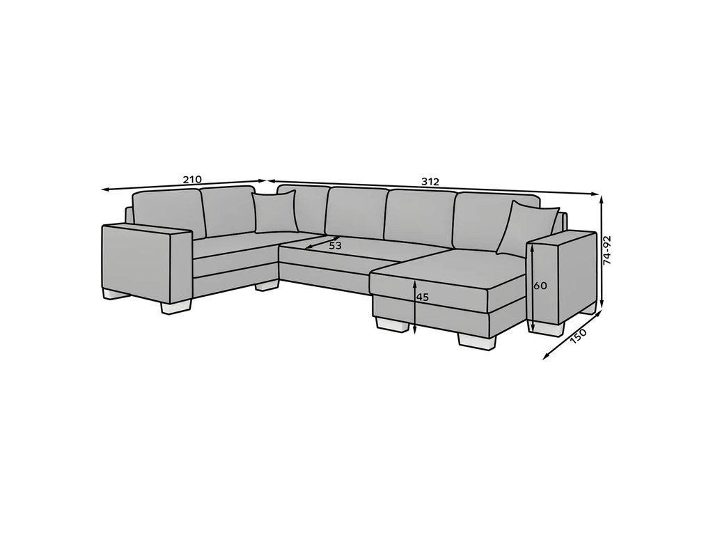 Šířka 312 cm, výška 74 - 92 cm, hloubka 210 cm. Spací plocha 285x130 cm. Všestranná sedačka do tvaru U. Rozkládací mechanismus s úložným prostorem. Výběr z mnoha barevných variant čalounění. V pravé i levé orientaci rohu.