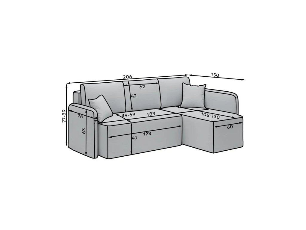 Šířka 206 cm, výška 77-89 cm, hloubka 76 - 150 cm (delší strana). Moderní komfortní pohovka. Se spací plochou 184x115 cm a úložným prostorem. Výběr z mnoha barevných variant čalounění.
