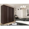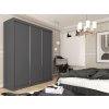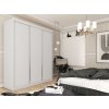 Šířka 180 cm, hloubka 61 cm, výška 216 cm. Moderní šatní skříň s třemi posuvnými dveřmi bez zrcadel a velkým úložným prostorem s uspořádáním ze dvou šuplíků, sedmi polic a dvěma šatními tyčemi.