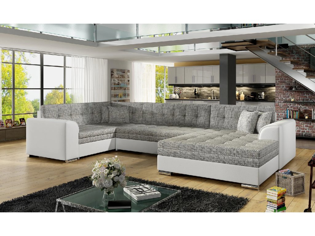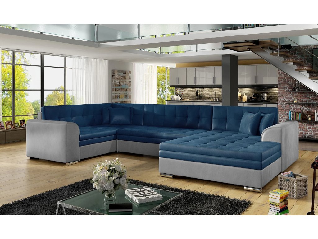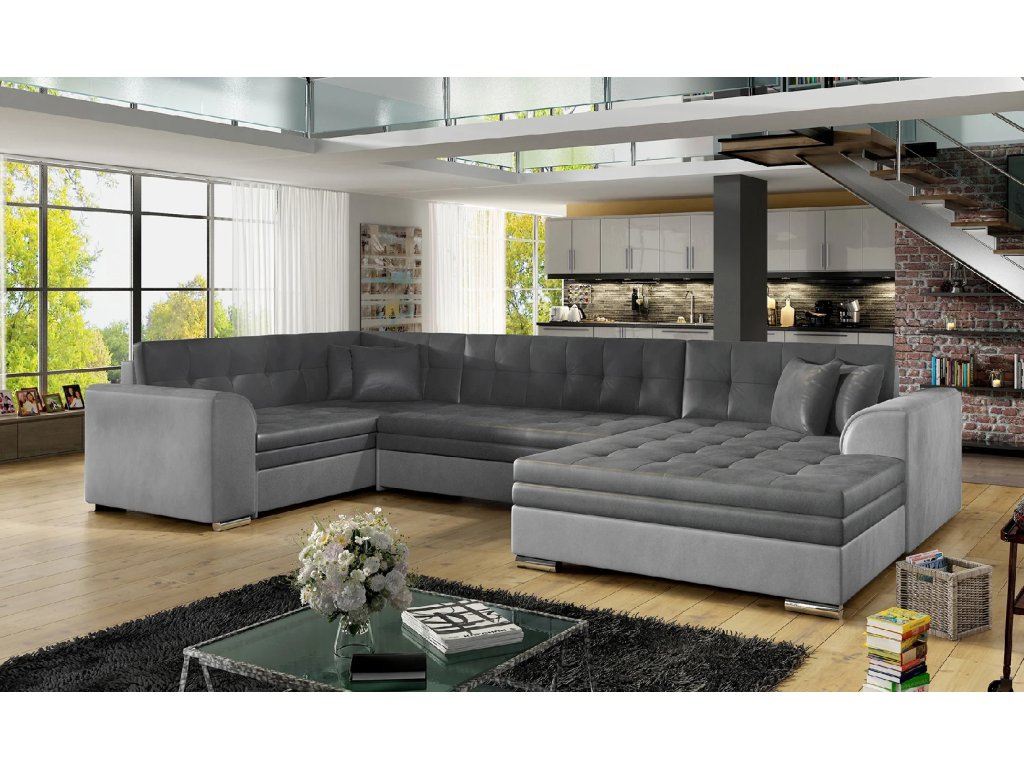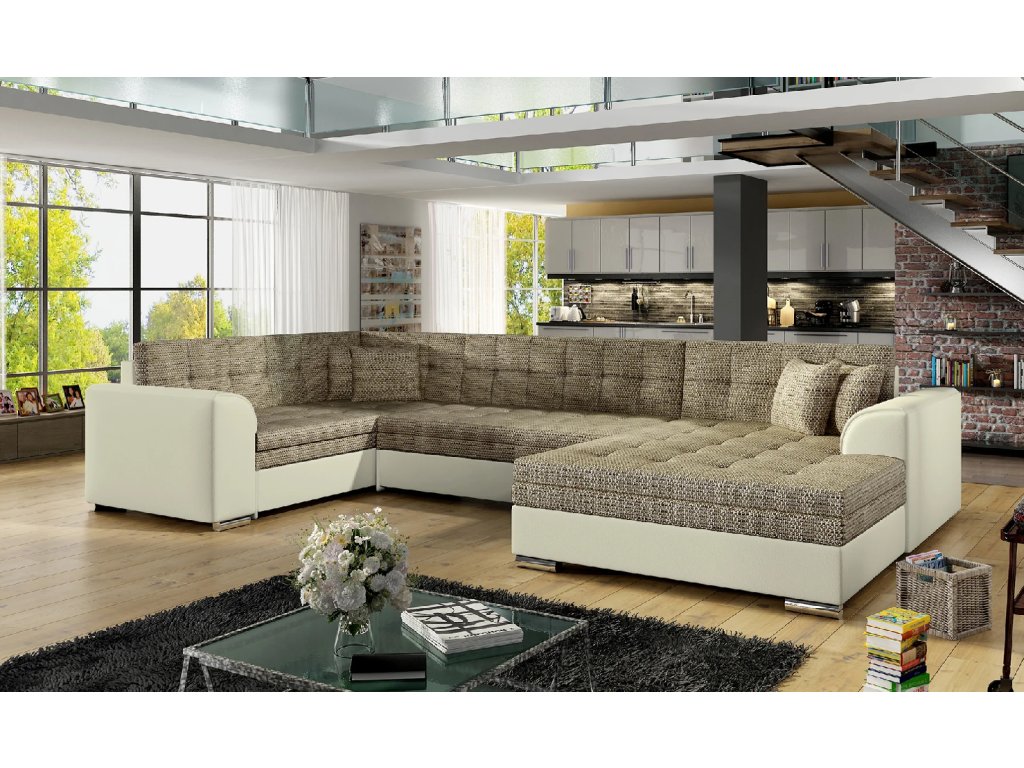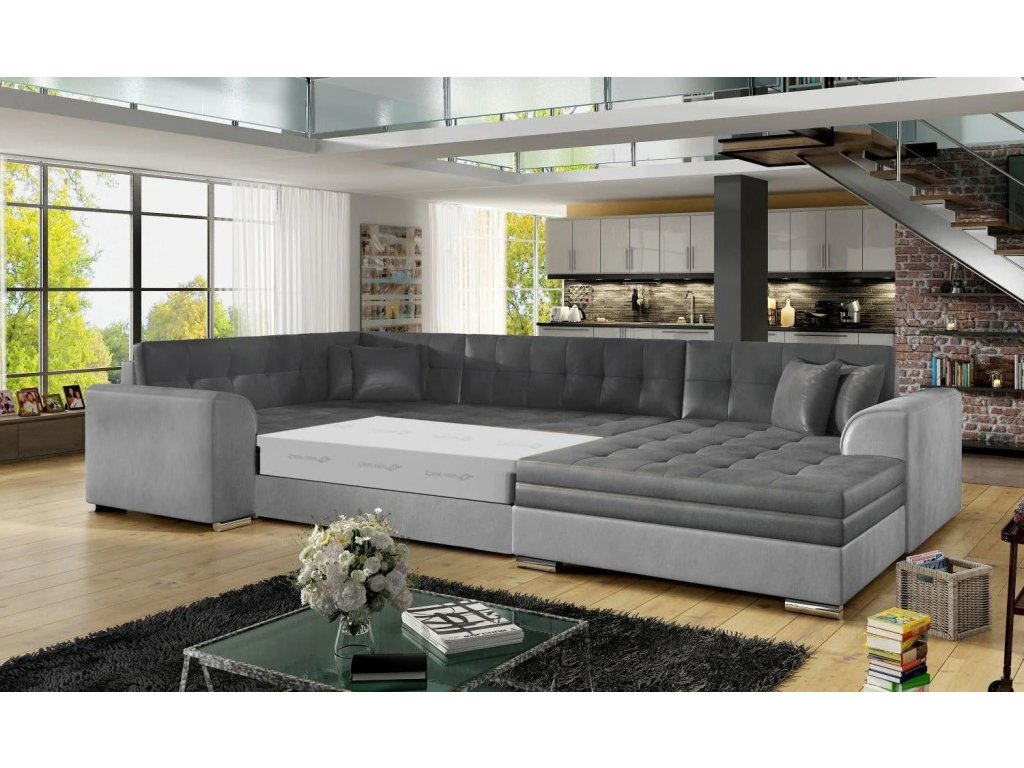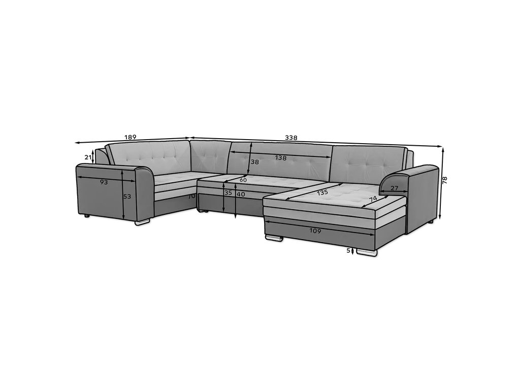 Šířka 338 cm, výška 78 cm, hloubka 189 cm. Spací plocha 275x126 cm. Útulná a pohodlná sedací souprava do tvaru U. Bez úložného prostoru s rozkládacím mechanismem. Výběr z mnoha barevných variant čalounění.