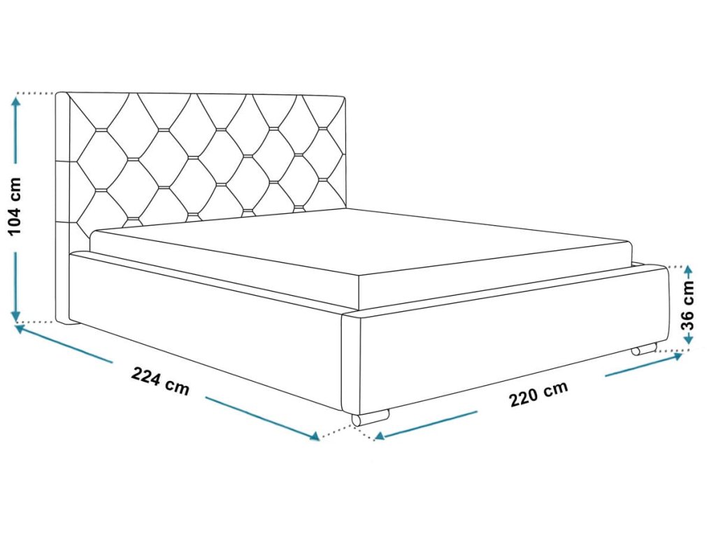 Šířka 220 cm, délka 224 cm. Velká postel se zdobeným čelem. Součástí lůžka je pevný kovový rošt na který si můžete dokoupit matraci. Výběr z několika barevných variant čalounění a nožiček.