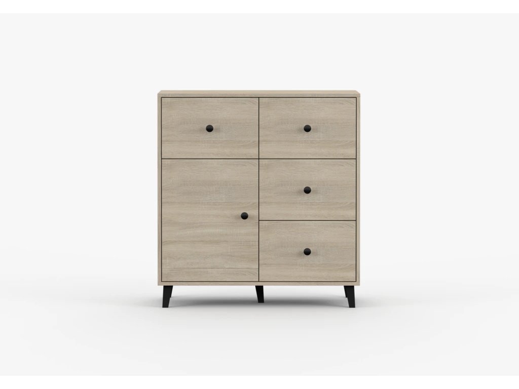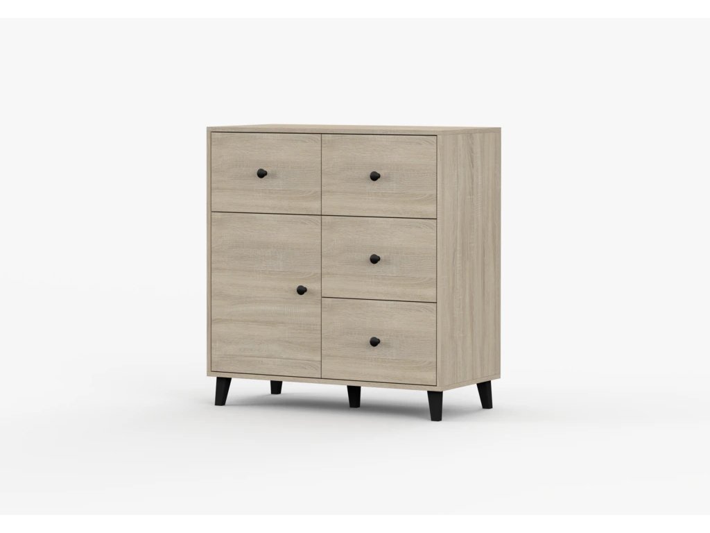 Šířka 90 cm, hloubka 45 cm, výška 97 cm. Minimalistická komoda s 4 šuplíky a 1 dvířky, které mají velký úložný prostor. Komoda disponuje černými kovovými úchytkami.