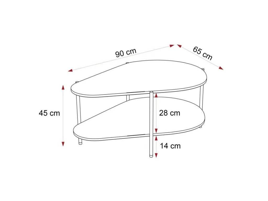 Délka 90 cm, šířka 65 cm, výška 45 cm. Konferenční stolek s kovovými nožičkami je moderní a elegantní doplněk do vašeho obývacího pokoje.